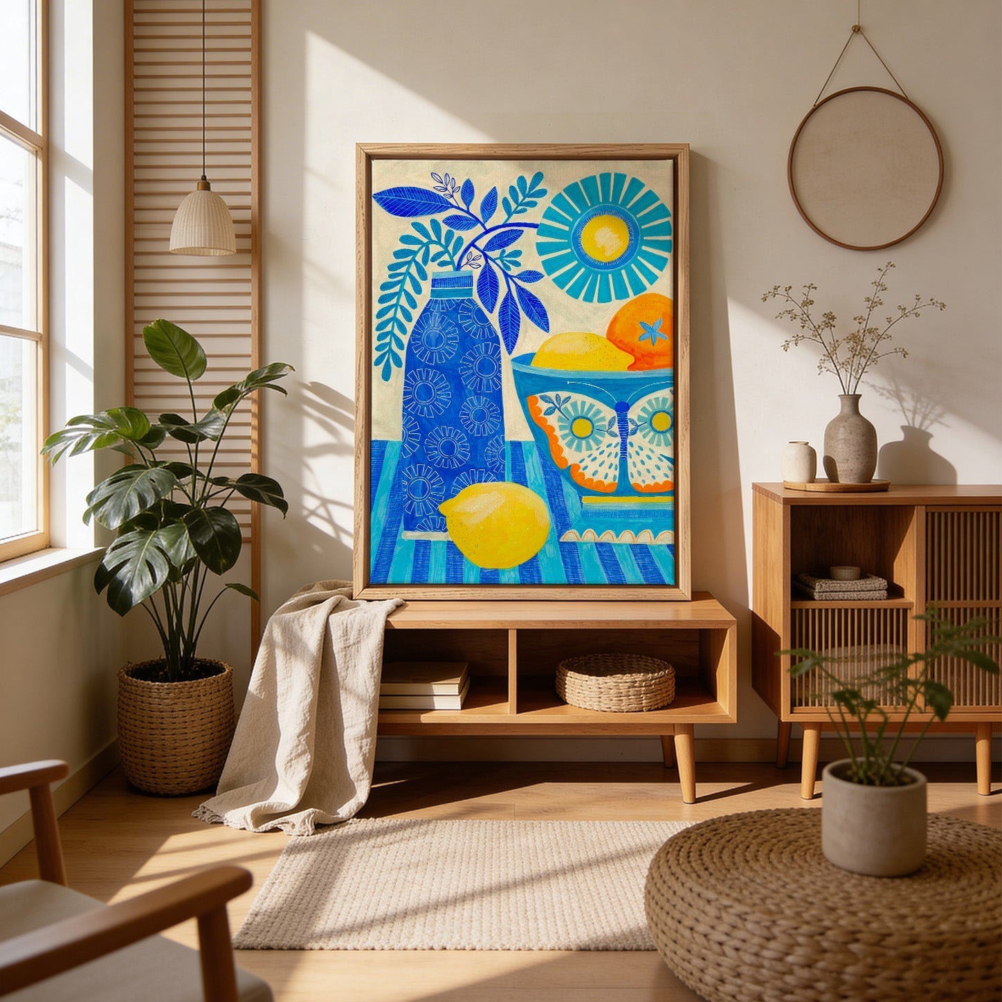 Auf Augenhöhe aufhängen — Die Mitte deines Prints sollte etwa 145–150 cm über dem Boden hängen. Die meisten hängen Kunst zu hoch — dann wirkt sie, als würde sie an der Wand schweben.