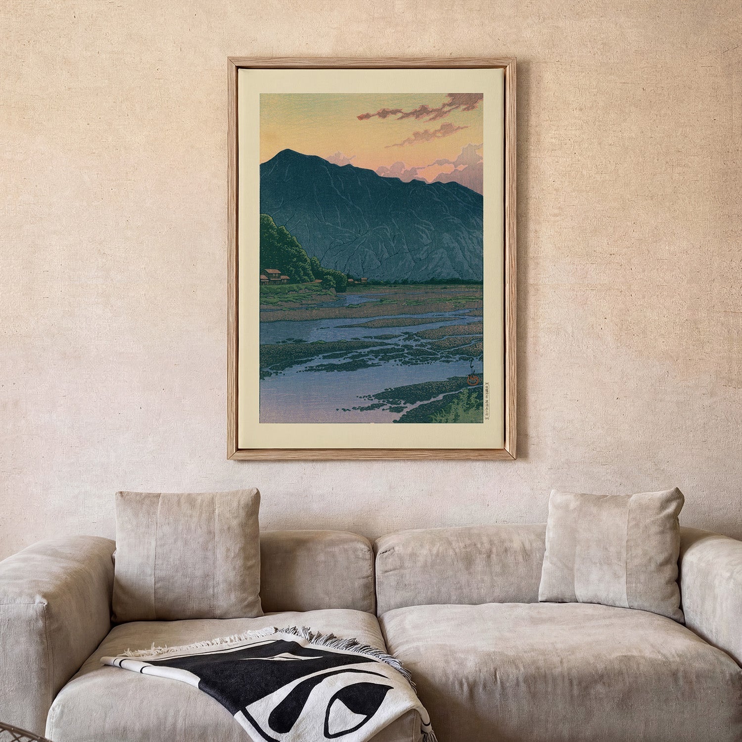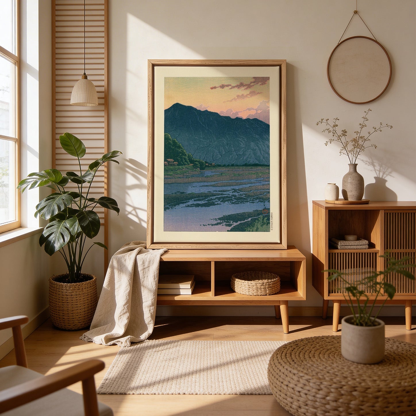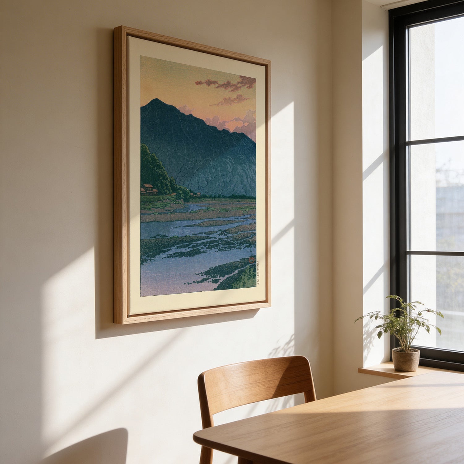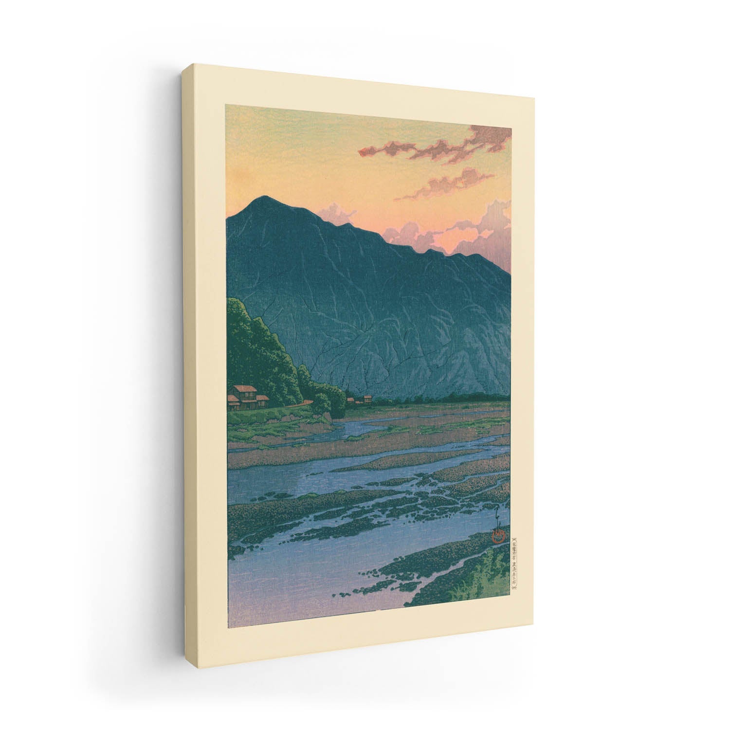 Auf Canvas wird die Abendwärme von Hasuis Palette noch reicher und einhüllender – Bernsteinlicht und tiefer Schatten mit echter Oberflächentiefe. Dieses Leinwandbild hält die hereinbrechende Dämmerung mit einer Haptik fest, die es zu einem außergewöhnlichen Kunstdruck für ruhige Innenräume macht.