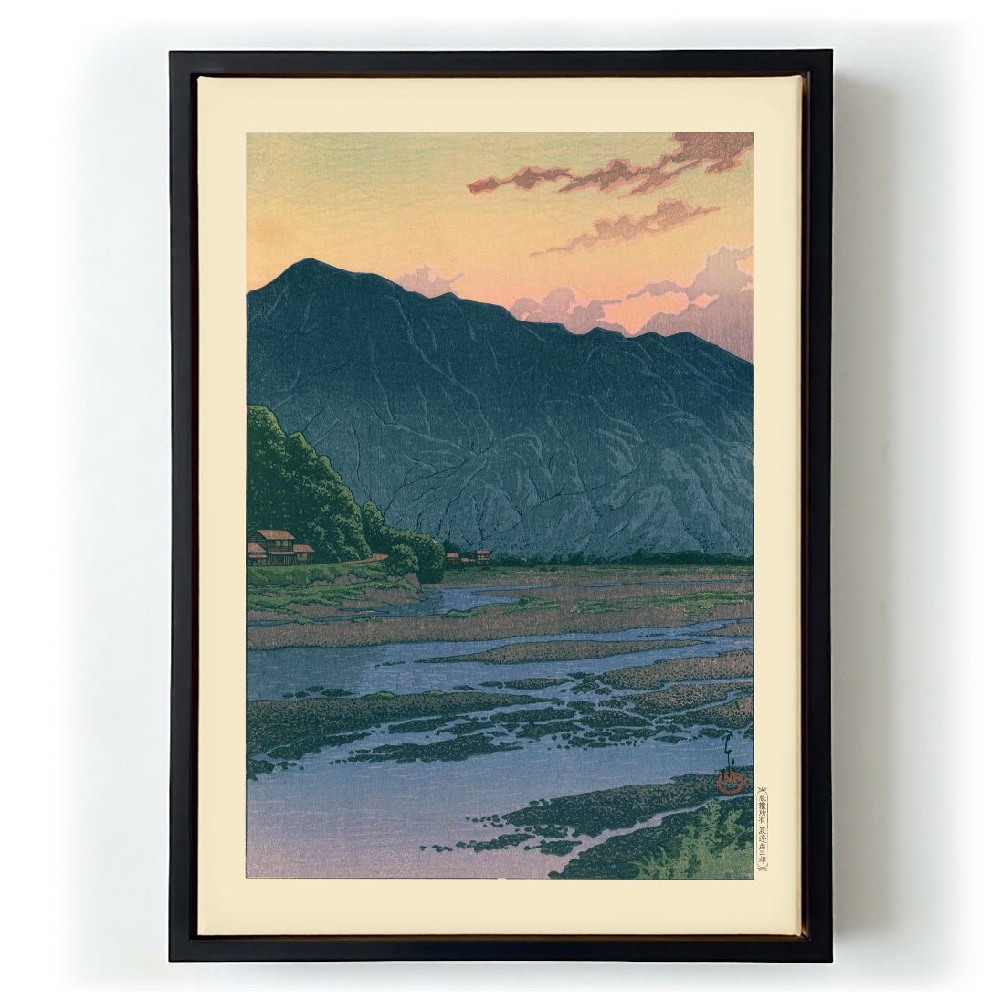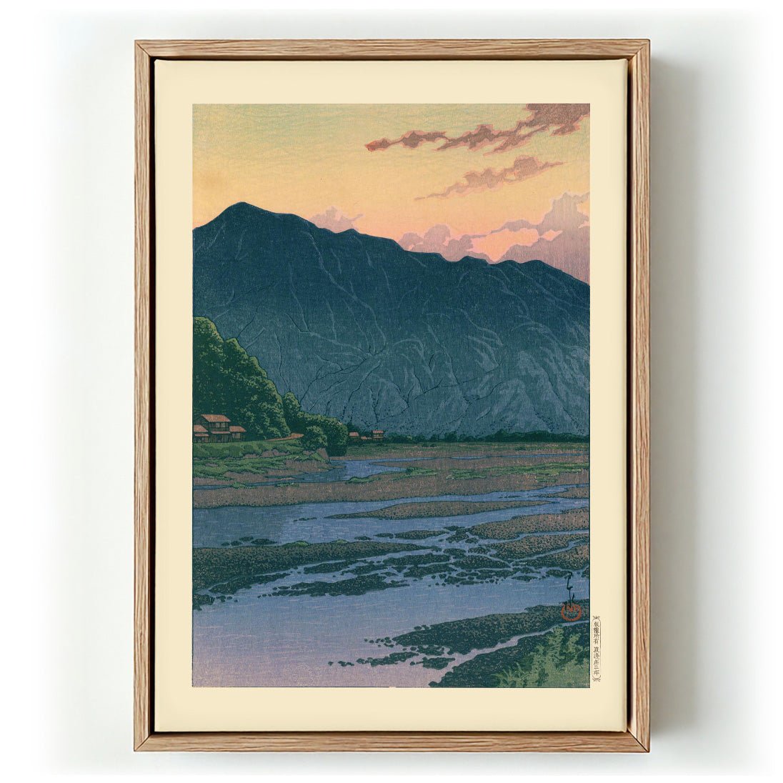 Chichibu in the Evening versinkt in der warmen Stille des späten Tages in einem Bergtal – Dächer fangen das letzte waagerechte Licht vor einem sich vertiefenden Himmel. Hasui Kawase schichtet die Komposition mit seiner typischen Präzision: Dorf, Baumreihe und Berg in ruhiger Staffelung, die Palette wechselt von Bernstein und Rost am Grat zu Indigo darüber. Die Stimmung ist vertraut und still – ein Markenzeichen seiner Shin-Hanga-Landschaften aus dem ländlichen Japan.