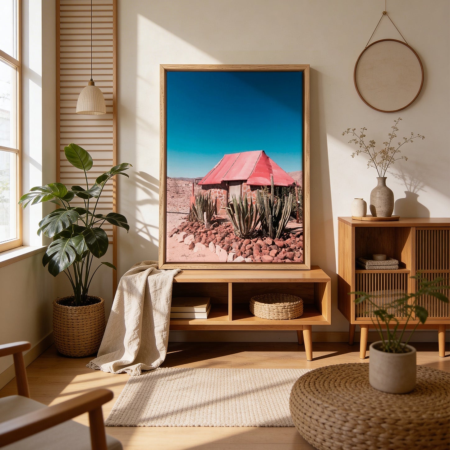 Auf Augenhöhe aufhängen — Die Mitte deines Prints sollte etwa 145–150 cm über dem Boden hängen. Die meisten hängen Kunst zu hoch — dann wirkt sie, als würde sie an der Wand schweben.