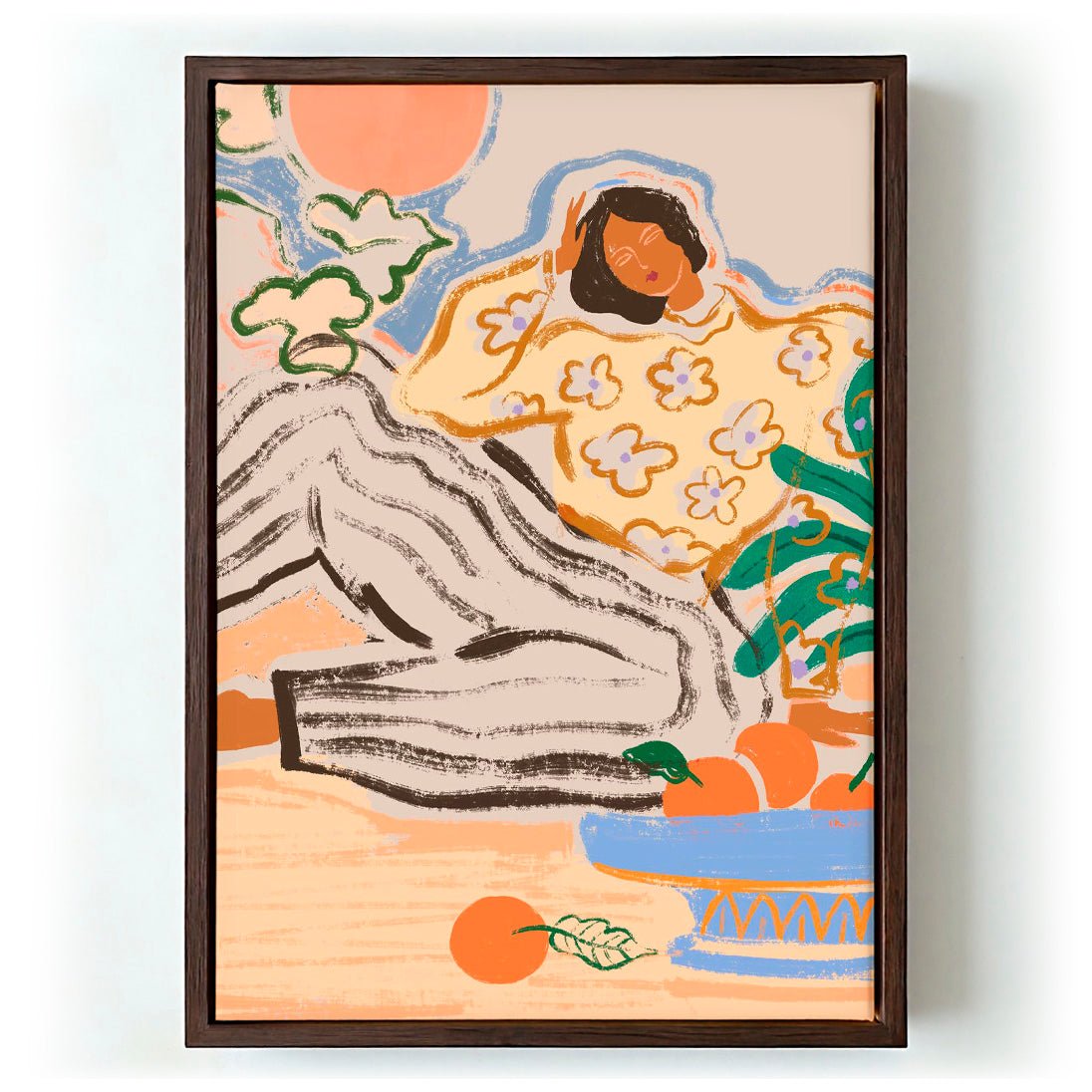 Lazydays bewegt sich zwischen Malerei und Illustration, zwischen Innenraum und Garten. Arty Guava schichtet botanische Formen – große tropische Blätter, sanfte Blüten, von Laub halb verborgene Figuren – zu einer Komposition, die eine ganz besondere Qualität des warmen, ungehetzten Nachmittagslichts einfängt. Die Palette ist üppig, aber nicht laut, die Stimmung wirklich entspannt. Es ist das Bild, das Zeit vor ihm belohnt: Details tauchen langsam auf, und das Gefühl von Leichtigkeit wird zu etwas, zu dem man immer wieder zurückkehrt. Eine Feier der Stille ohne Sentimentalität.