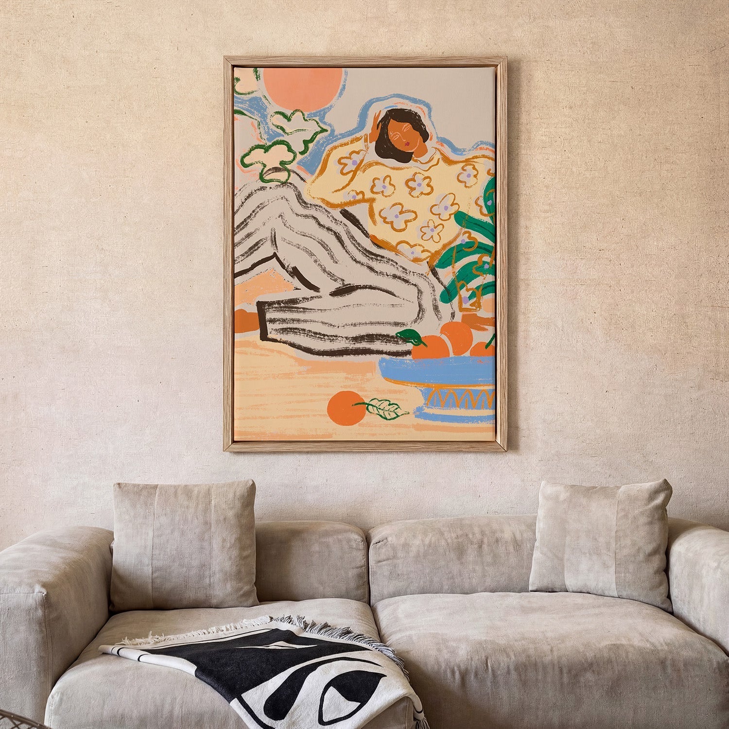 Auf Augenhöhe aufhängen — Die Mitte deines Prints sollte etwa 145–150 cm über dem Boden hängen. Die meisten hängen Kunst zu hoch — dann wirkt sie, als würde sie an der Wand schweben.