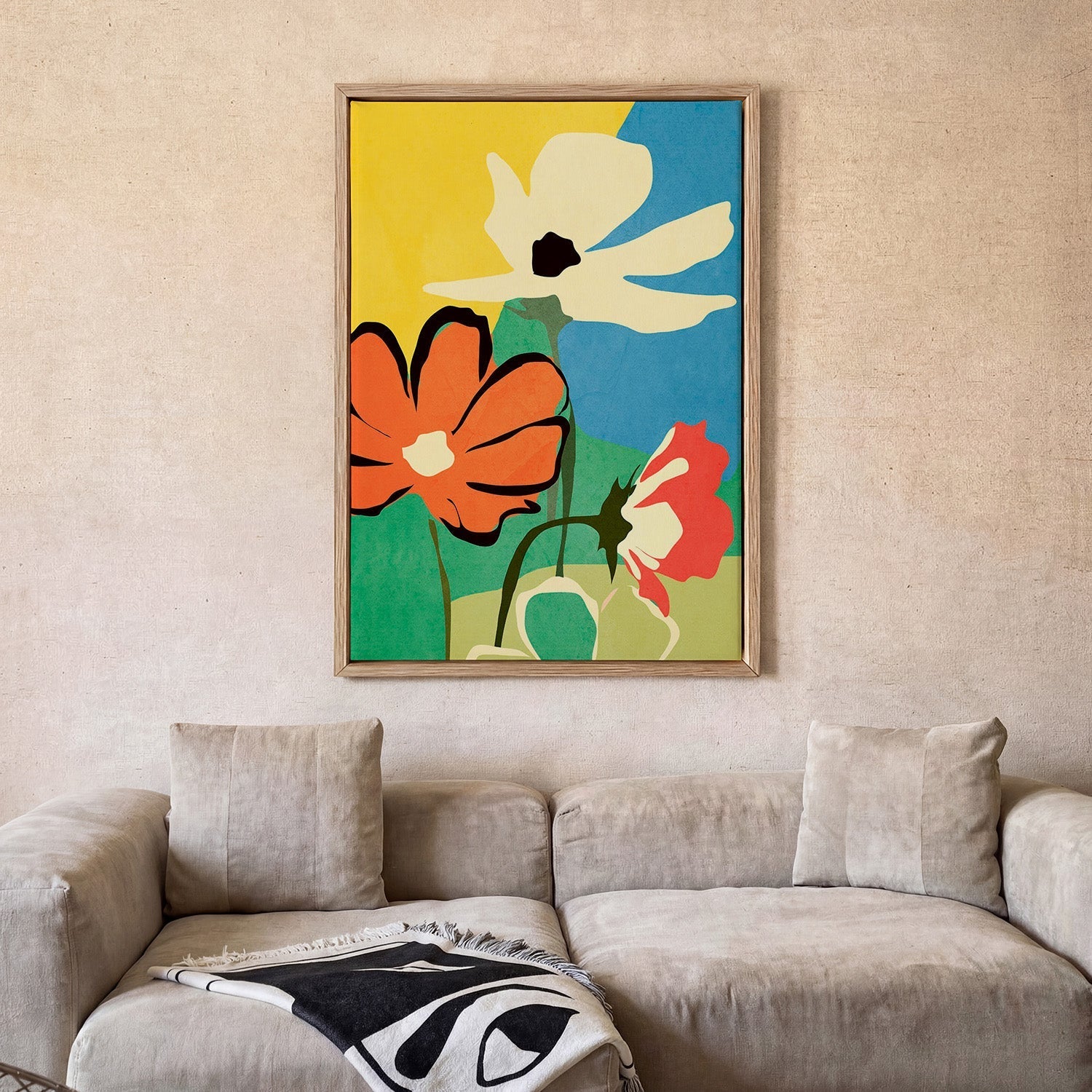 Kontrast schlägt Matchen — Du musst die Wandfarbe nicht genau treffen. Ein Print in dunklen Tönen an einer hellen Wand oder ein starkes Motiv in einem ruhigen Raum wirkt oft viel spannender als eine perfekte Farbübereinstimmung.