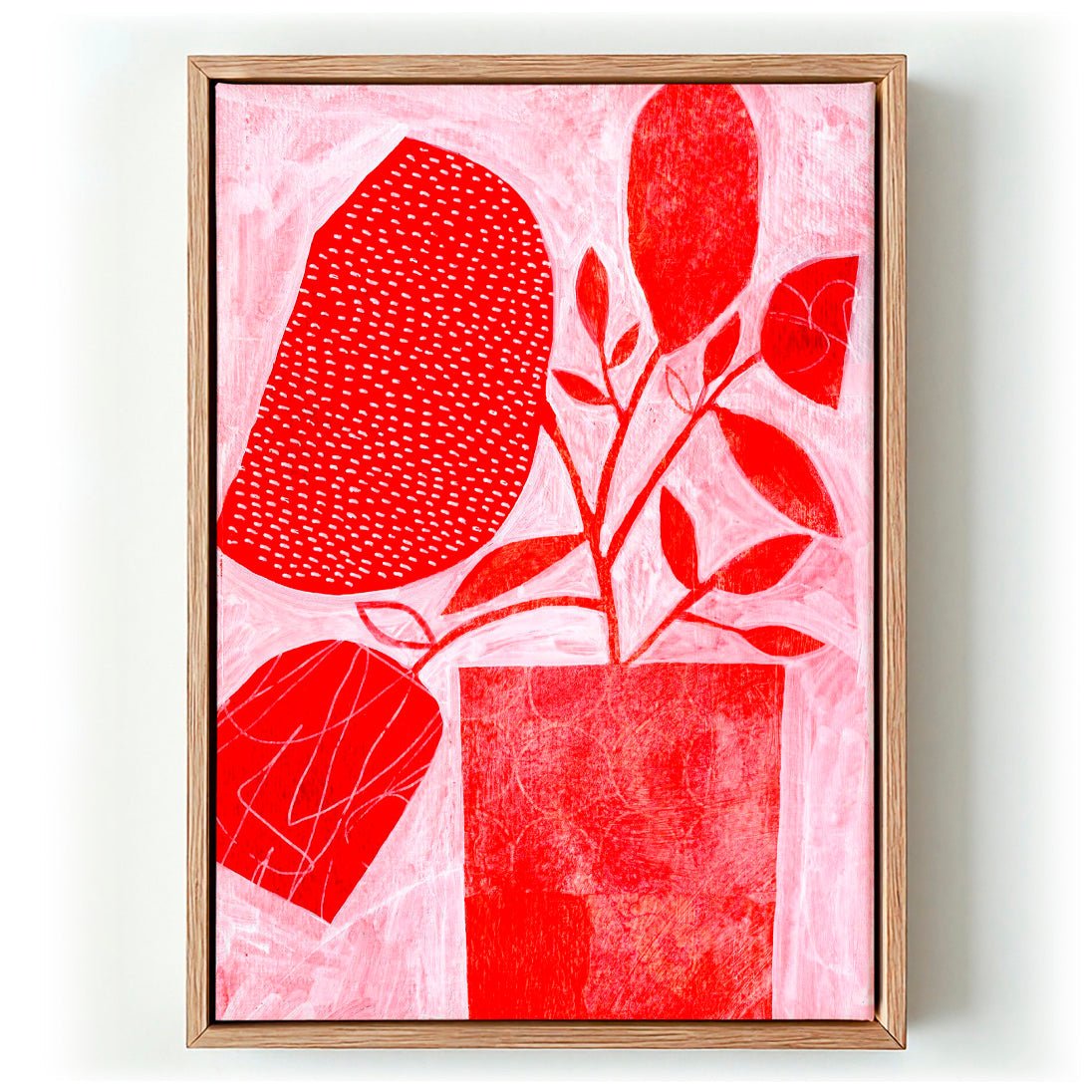 Red Floral Vase tritt mit voller Überzeugungskraft auf. Susan Black füllt den Rahmen mit einem reich geschichteten Stillleben – eine Vase, überfließend mit Blüten in ihrer charakteristischen maximalistischen Handschrift. Karmesinrote Blütenblätter drängen sich an gemusterte Stiele, und der Hintergrund rückt mit konkurrierenden Formen und Texturen heran, statt in ein neutrales Nichts zu weichen. Eine Komposition, die sich der Vereinfachung verweigert und Intensität durch Anhäufung aufbaut: Spur über Spur, Farbe gegen Farbe. Und doch: Bei aller Dichte herrscht Balance – das Auge bewegt und kehrt zurück, ohne sich zu verlieren.