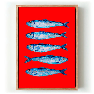 Ein dichtes Bündel Sardinen füllt das Bild, ihre silbrigen Körper in dicken, ausdrucksstarken Pinselstrichen vor einem satten Beerenrot festgehalten. Das Gemälde vibriert vor taktiler Energie – Pinselführung, die an Ölimpasto erinnert, lässt jeden Fisch dreidimensional lebendig werden, während der tiefe Karminhintergrund die Komposition mit unverhohlener Wärme nach vorne drängt. Eine spielerische, fröhliche Interpretation des schlichten Dosenessen-Stilllebens, veredelt durch schiere chromatische Selbstsicherheit.
