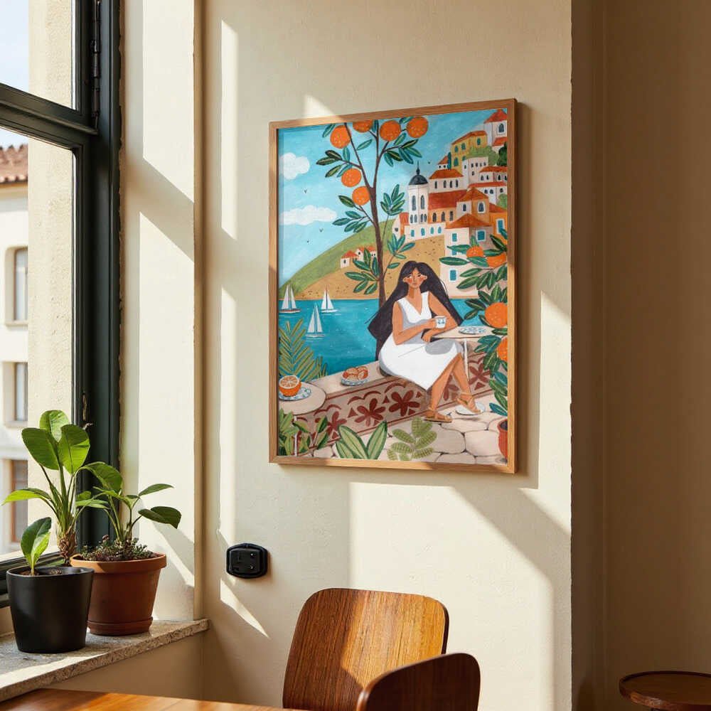 Travel Poster Frau an der Mittelmeerküste von Caroline Bonne Müller