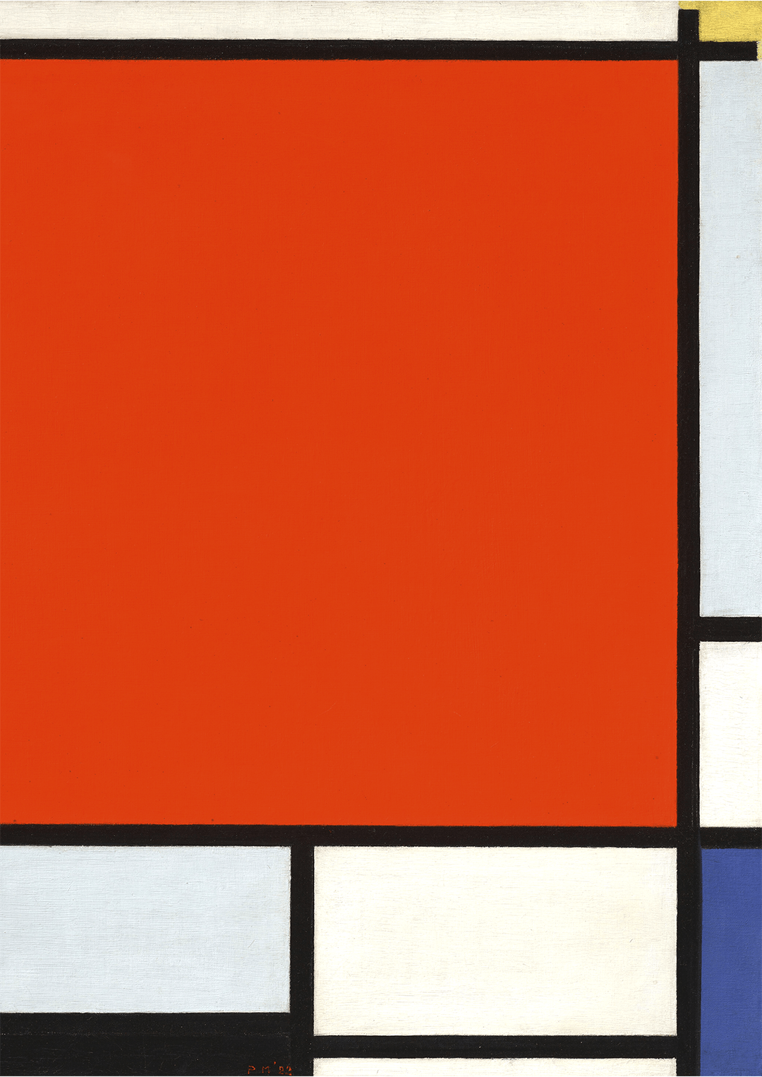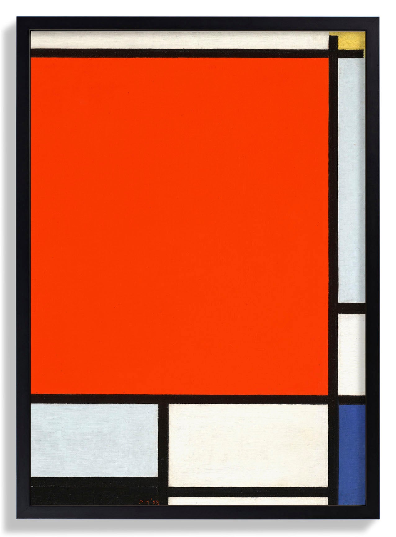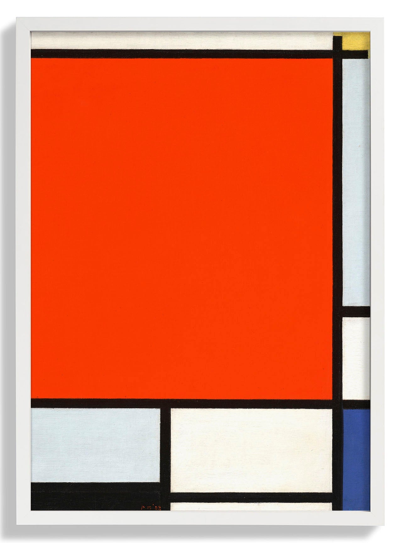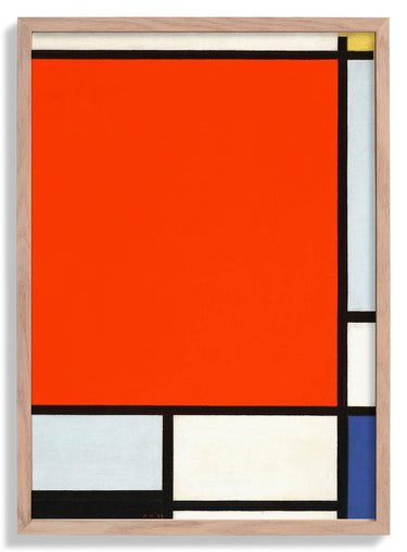 Komposition mit großer roter Fläche, blaugrau, gelb, schwarz und blau von Piet Mondrian