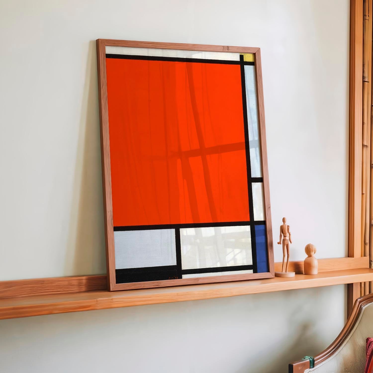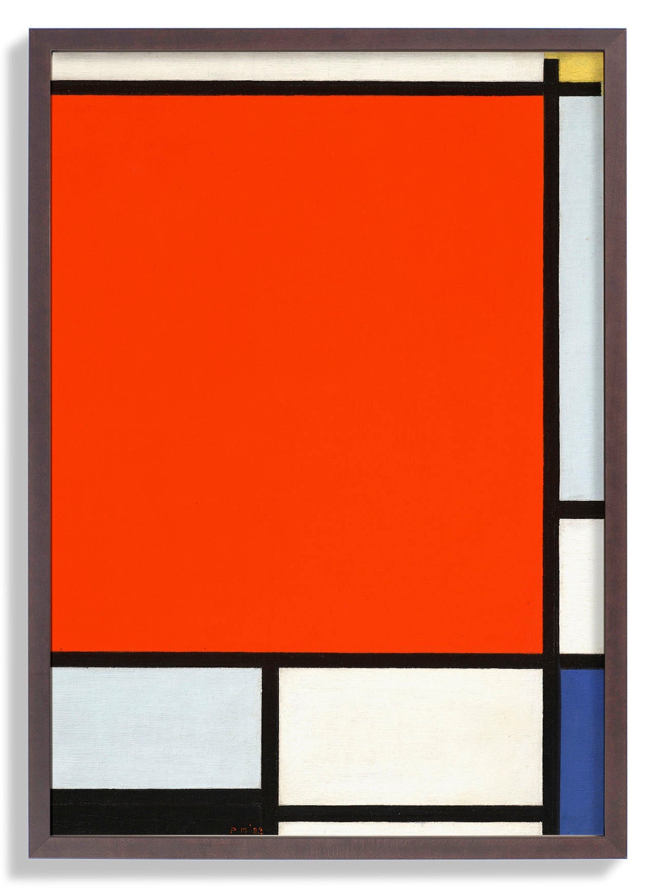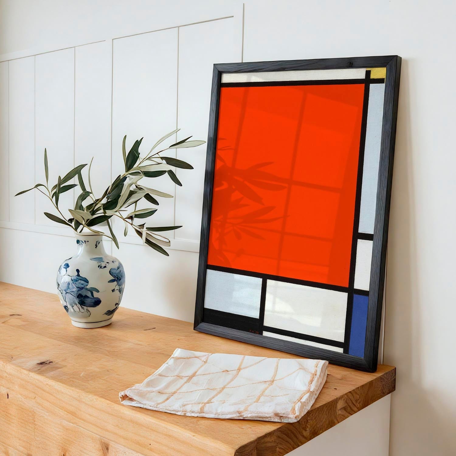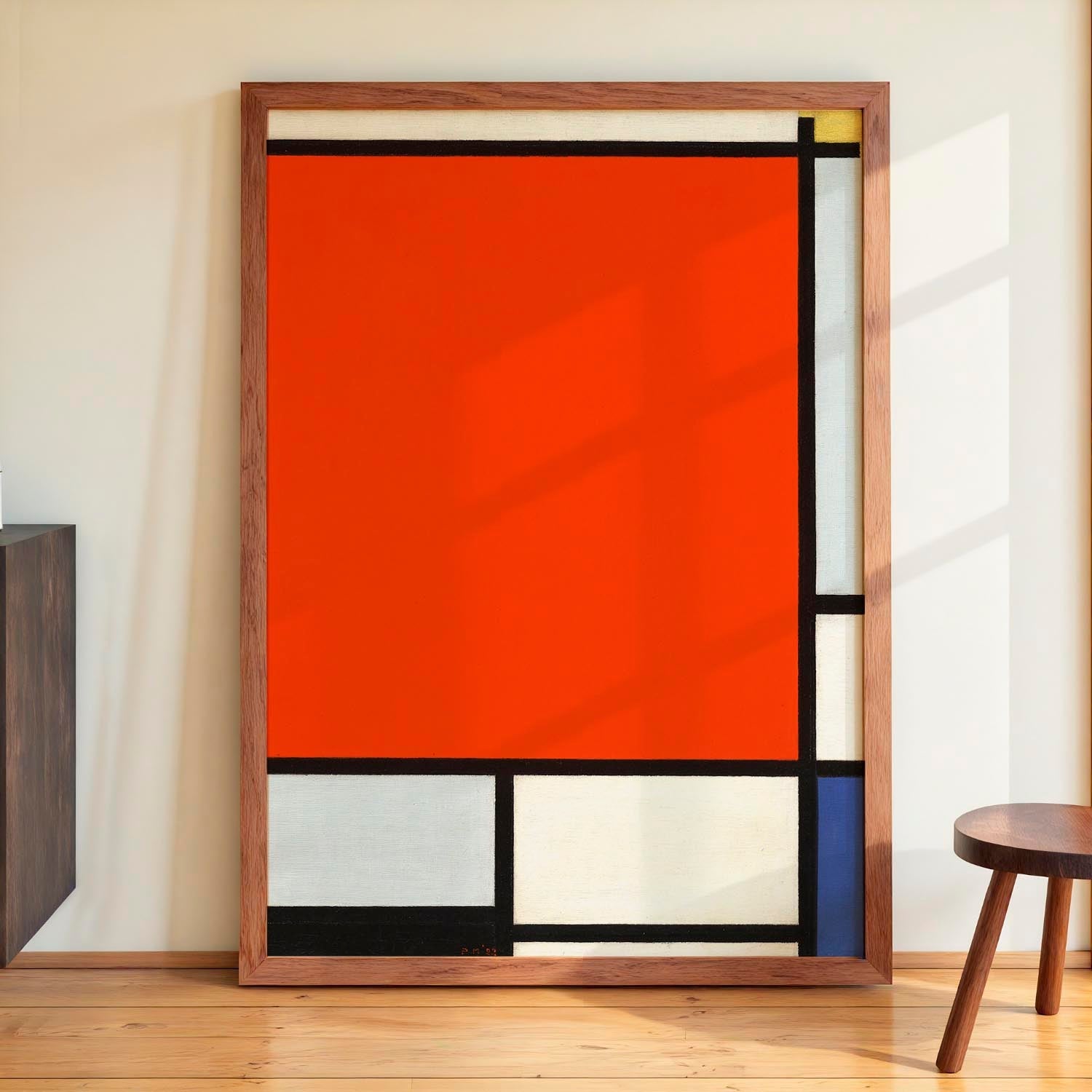 Komposition mit großer roter Fläche, blaugrau, gelb, schwarz und blau von Piet Mondrian