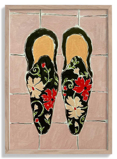 Schwarze Schuhe auf rosa Fliesen von Rushati Chowdhury