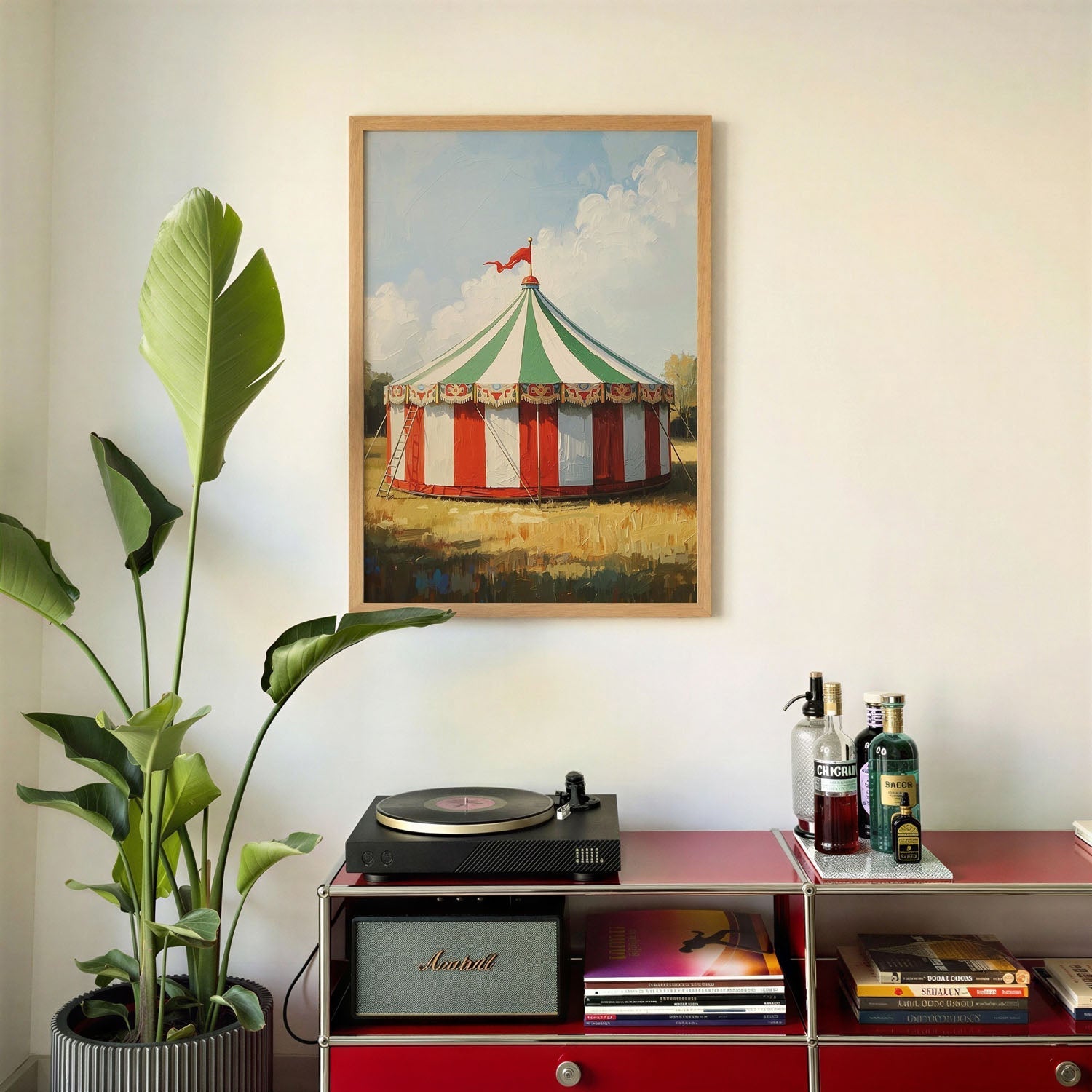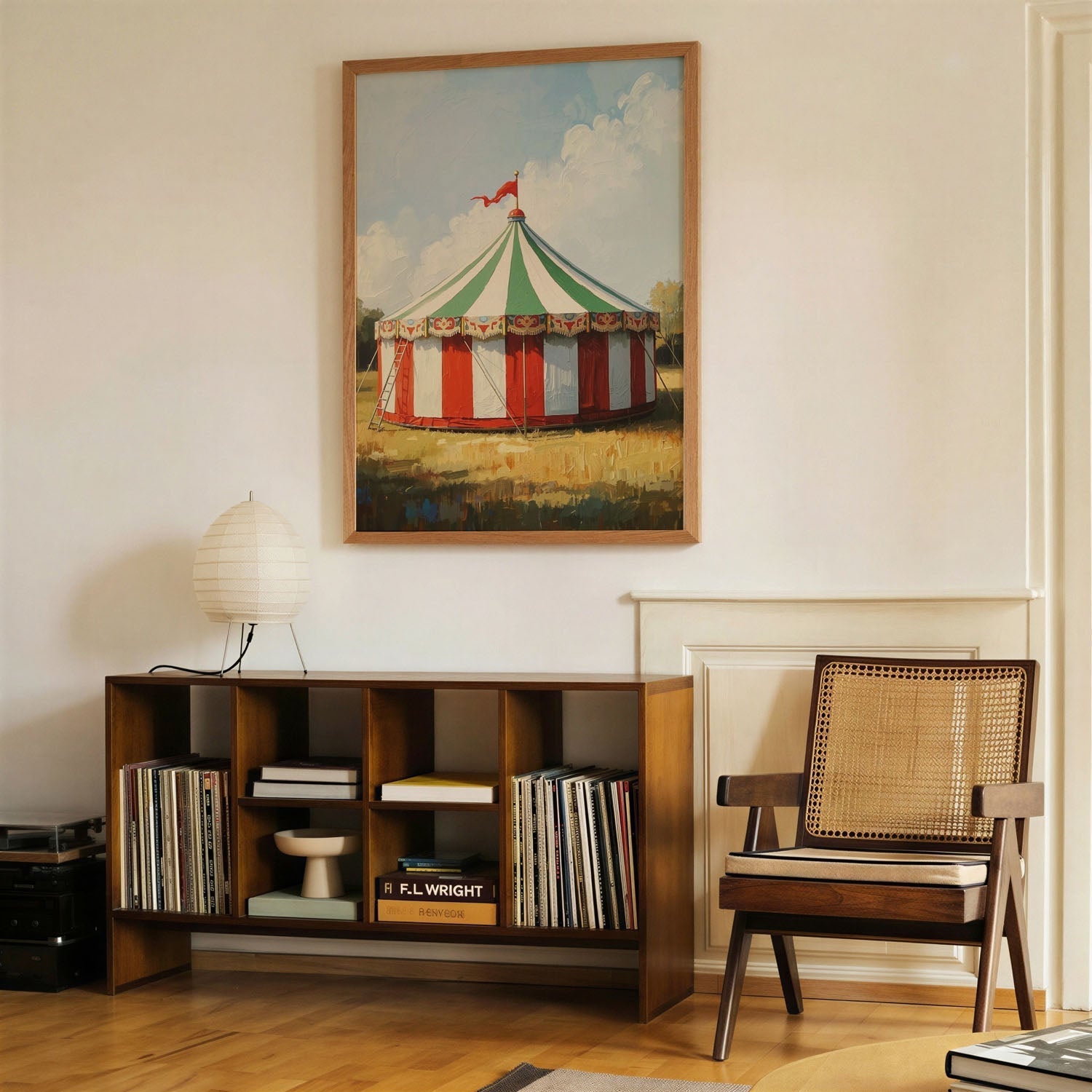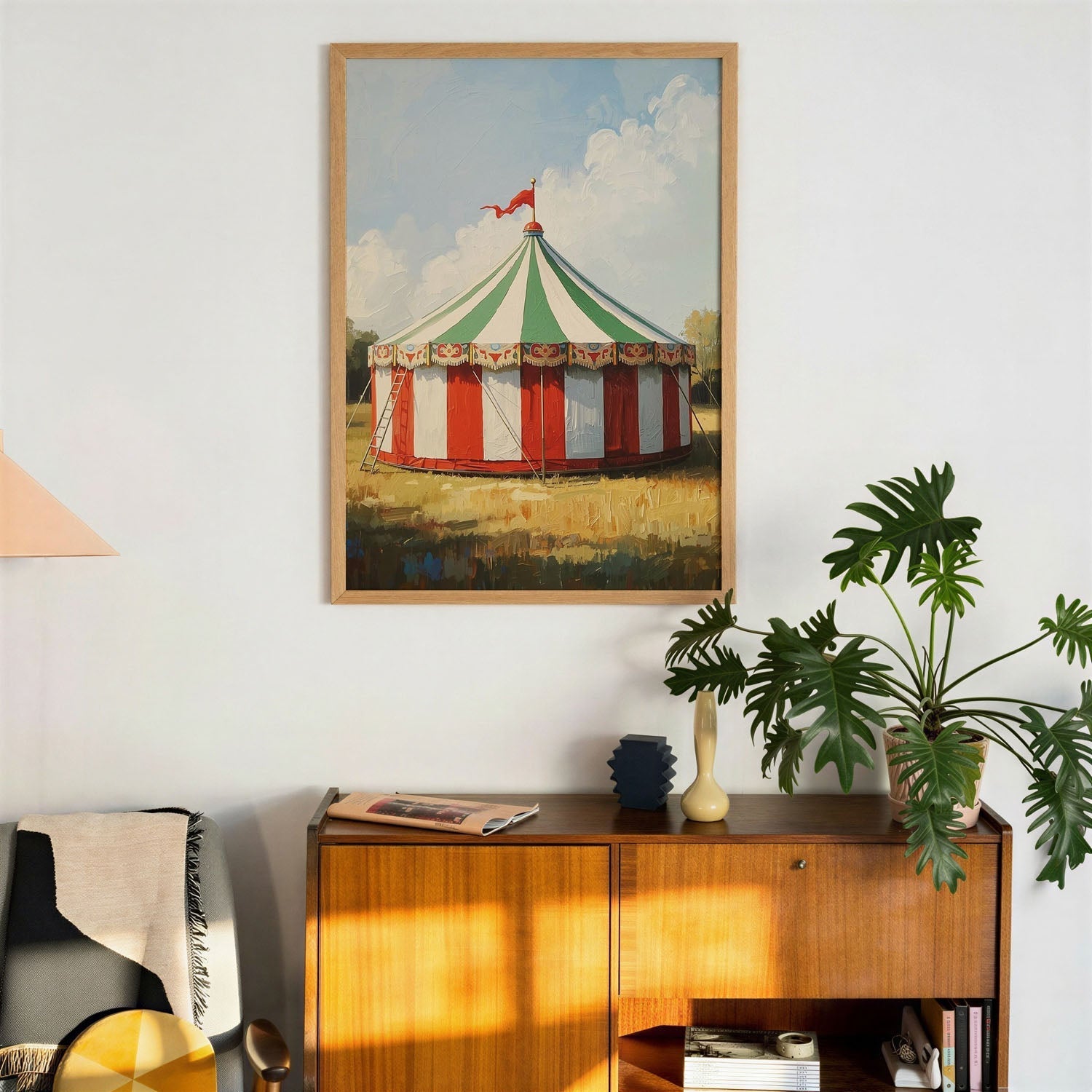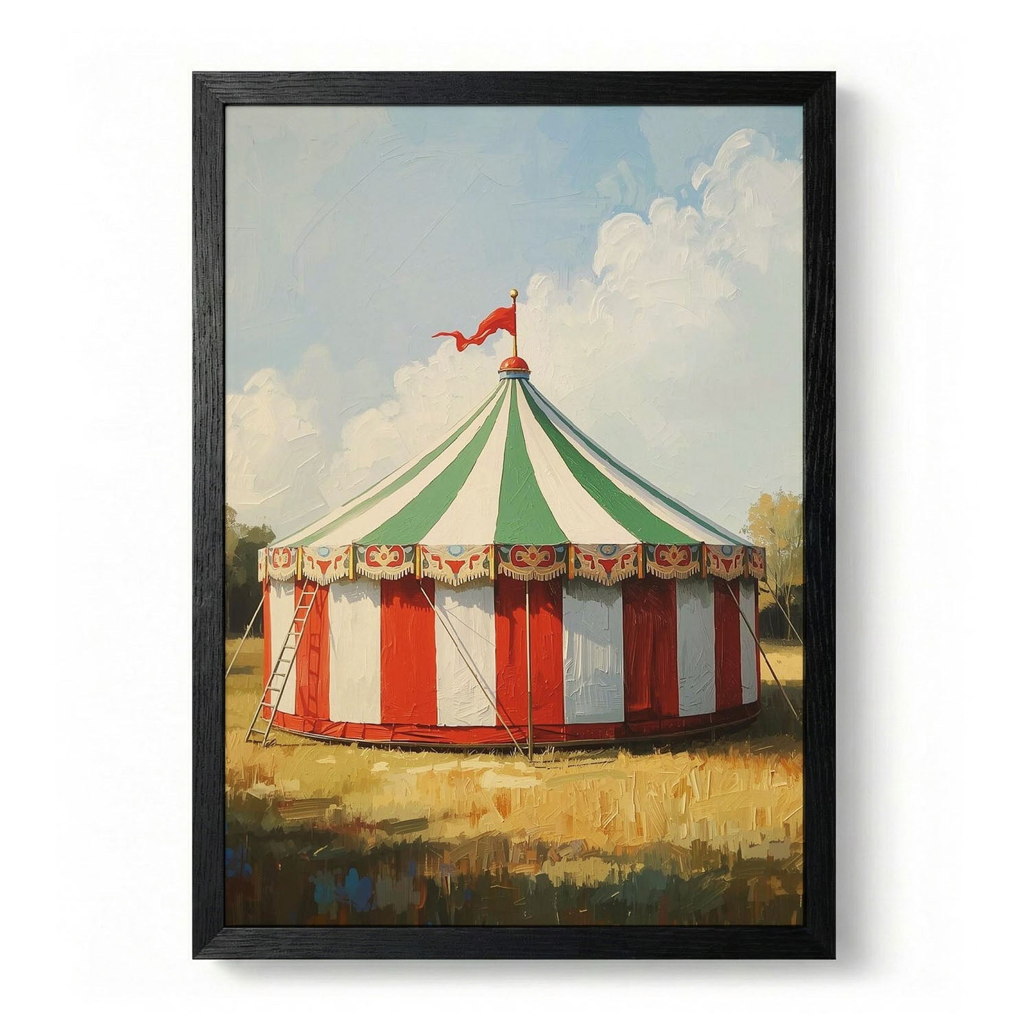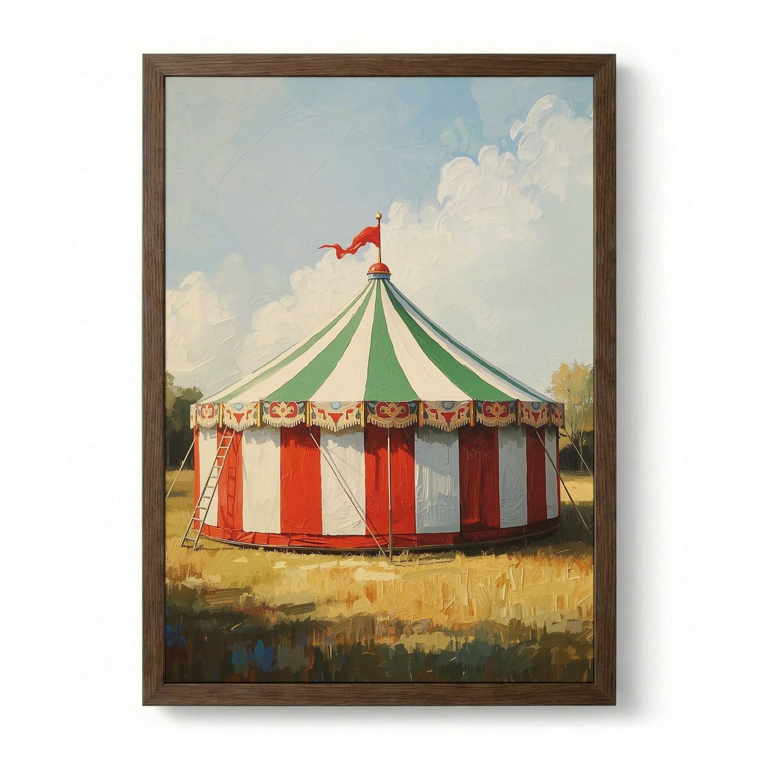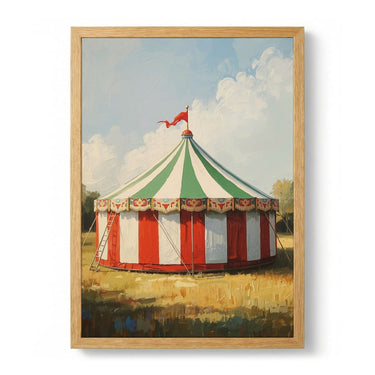 Classic Circus Tent is a vintage composition centred on illustration. A weathered palette and softened edges lend the scene a nostalgic, time-worn warmth. The vertical framing draws the eye upward and suits a single strong wall presence. Tonal transitions are handled with care, keeping detail legible at a distance while rewarding closer looking. The image is built to read as a single, settled presence on the wall rather than a busy surface.
