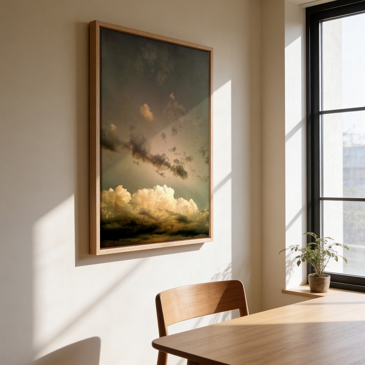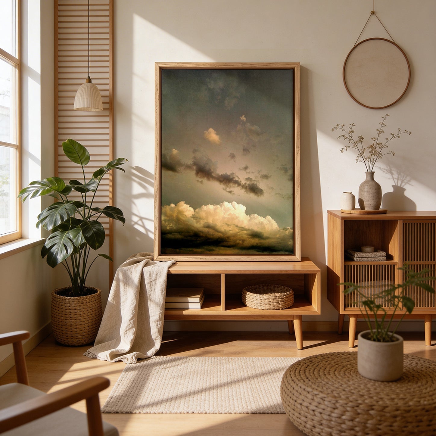 Auf Augenhöhe aufhängen — Die Mitte deines Prints sollte etwa 145–150 cm über dem Boden hängen. Die meisten hängen Kunst zu hoch — dann wirkt sie, als würde sie an der Wand schweben.