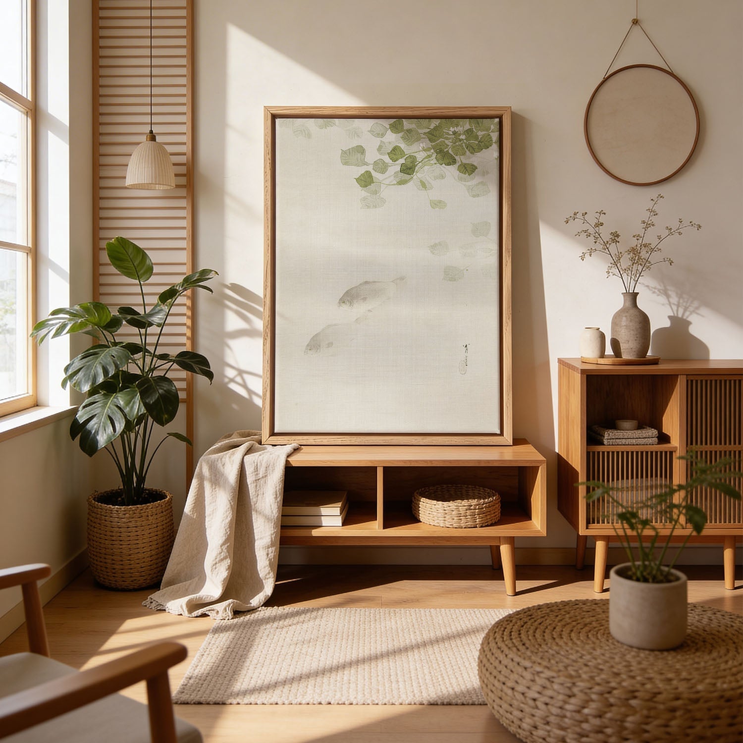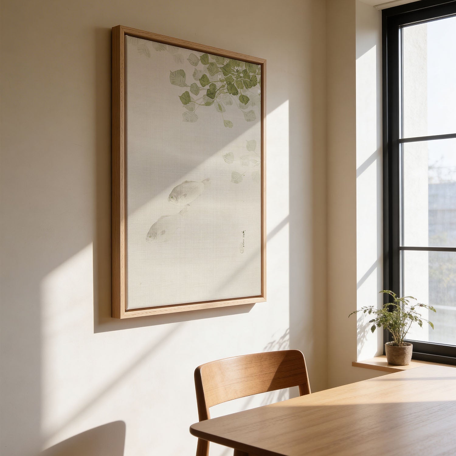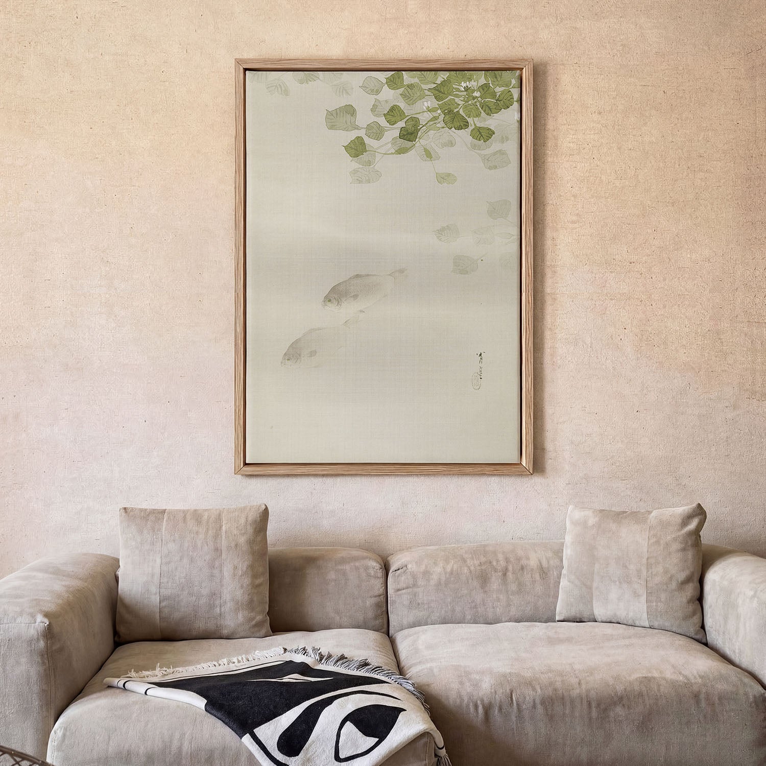 Auf Augenhöhe aufhängen — Die Mitte deines Prints sollte etwa 145–150 cm über dem Boden hängen. Die meisten hängen Kunst zu hoch — dann wirkt sie, als würde sie an der Wand schweben.