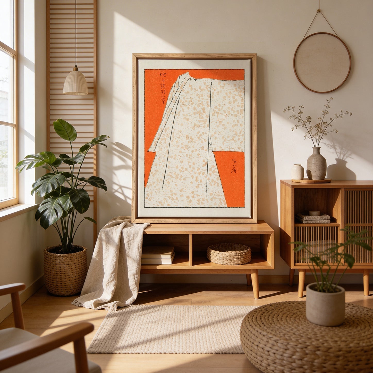 Auf Augenhöhe aufhängen — Die Mitte deines Prints sollte etwa 145–150 cm über dem Boden hängen. Die meisten hängen Kunst zu hoch — dann wirkt sie, als würde sie an der Wand schweben.