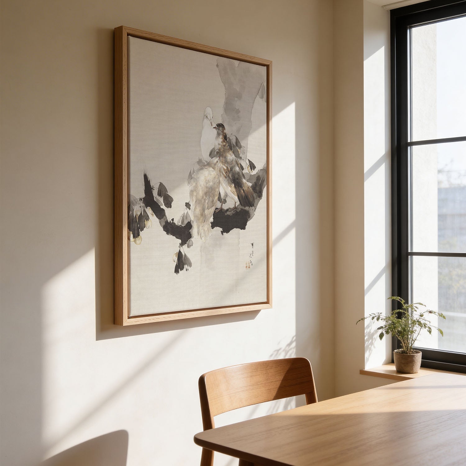 Kontrast schlägt Matchen — Du musst die Wandfarbe nicht genau treffen. Ein Print in dunklen Tönen an einer hellen Wand oder ein starkes Motiv in einem ruhigen Raum wirkt oft viel spannender als eine perfekte Farbübereinstimmung.
