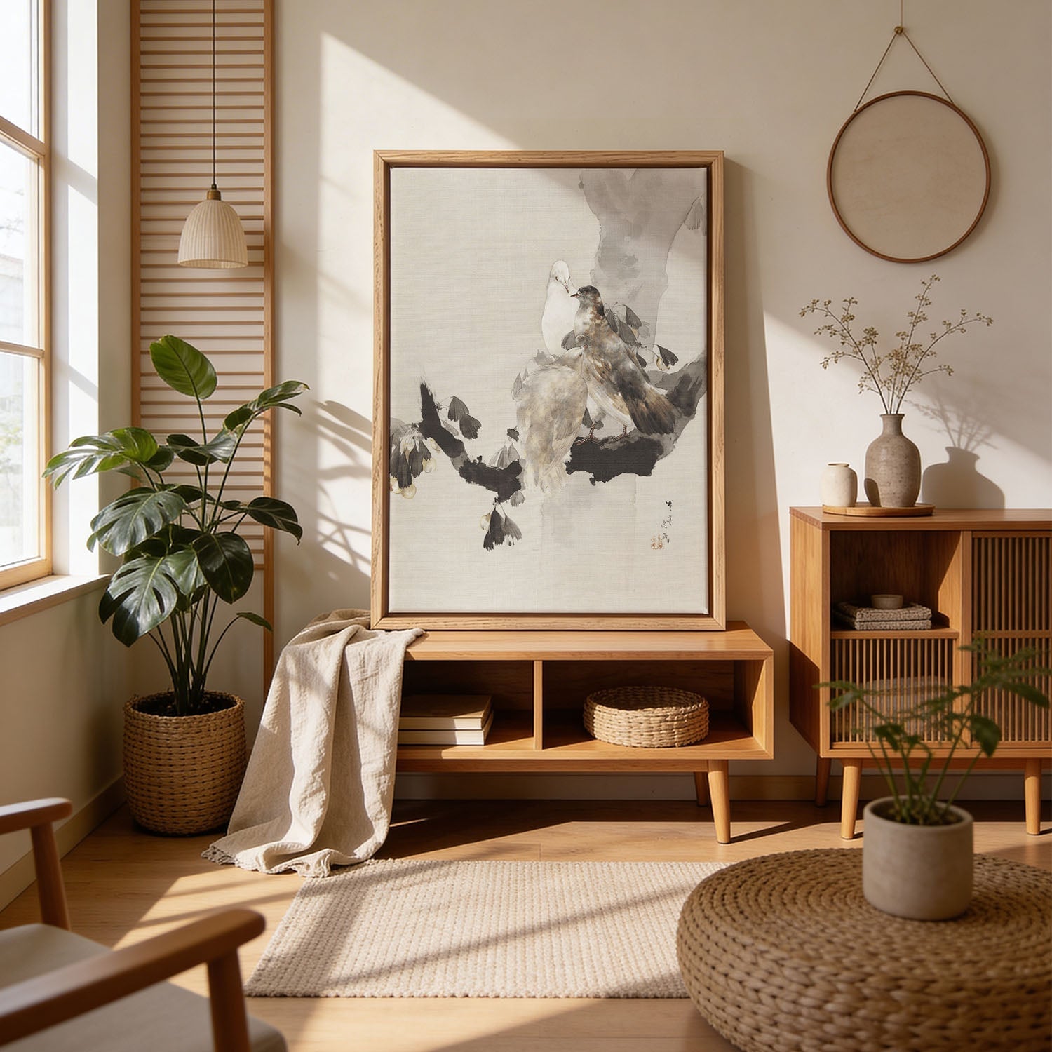 Auf Augenhöhe aufhängen — Die Mitte deines Prints sollte etwa 145–150 cm über dem Boden hängen. Die meisten hängen Kunst zu hoch — dann wirkt sie, als würde sie an der Wand schweben.