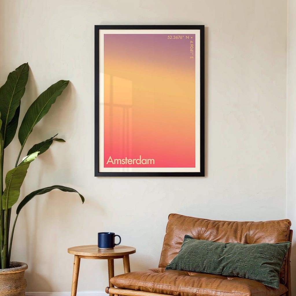 Usamos un perfil de marco estándar: 2 cm (0,8" pulgadas) x 2 cm (0,8" pulgadas) (cara frontal x profundidad desde la pared). Las dimensiones finales de la impresión enmarcada añaden 2 cm al ancho y alto del tamaño de impresión seleccionado.