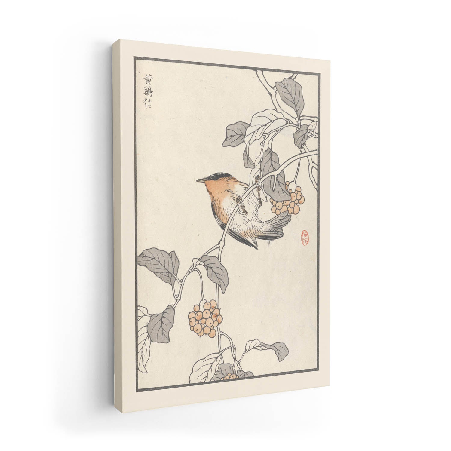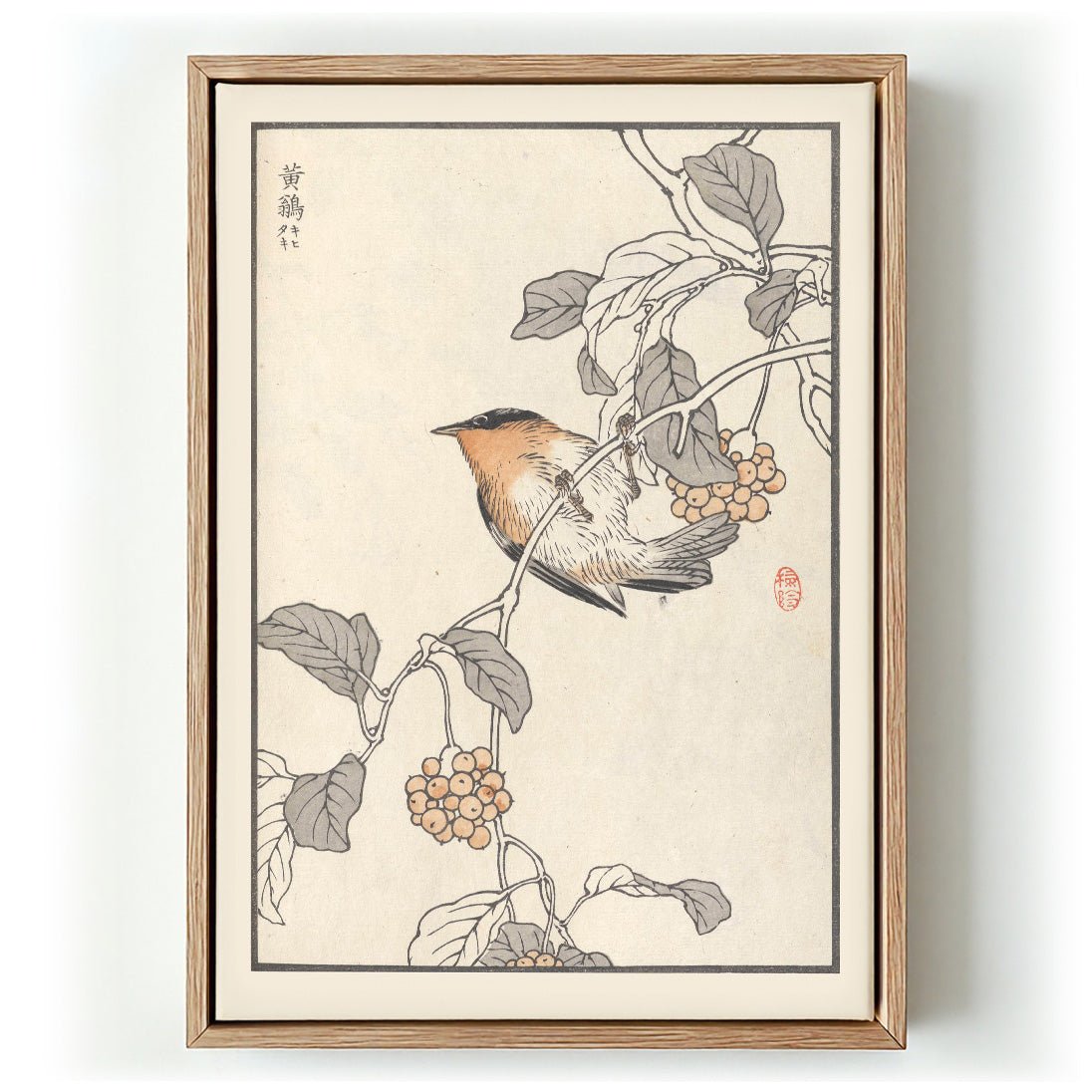 La lámina 16 de la serie Hyakucho Gafu presenta un único pájaro con la economía de línea que define el estilo maduro de Bairei. La composición se construye en torno a la quietud: un ángulo elegido con cuidado, una rama o un suelo implícito, y la criatura reproducida con la observación suficiente para sentirse viva sin caer en la ilustración. El espacio circundante no está vacío — sostiene la imagen a la manera de la pintura japonesa clásica, donde la contención es en sí misma una forma de presencia.