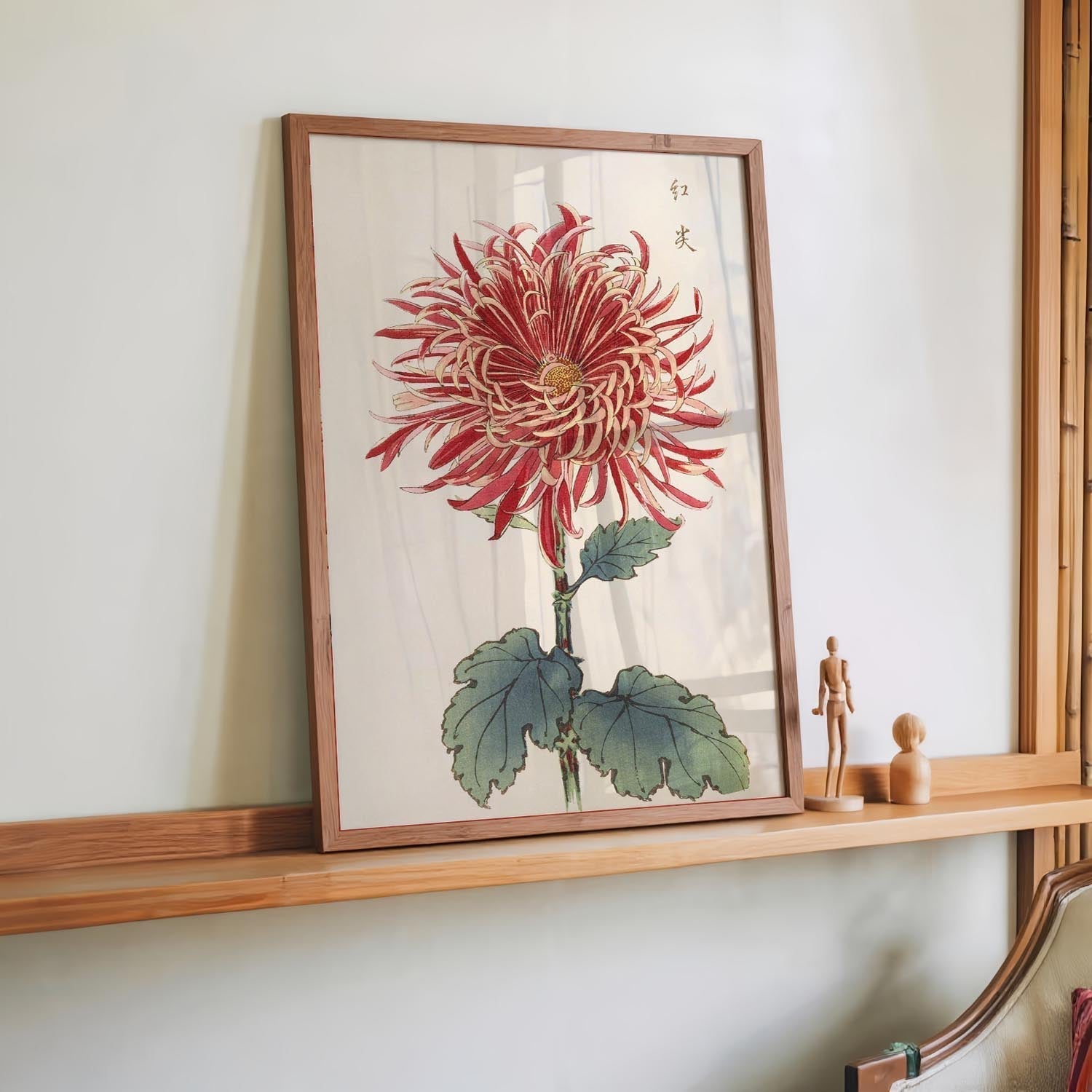 La série de chrysanthèmes de Hosegawa s'associe naturellement à d'autres œuvres d'art japonais de notre collection. Pour un thème botanique ciblé, combinez-la avec des estampes florales d'Ohara Koson ou des compositions d'oiseaux et de fleurs de Kono Bairei. L'esthétique de l'ère Meiji s'accorde bien avec les œuvres de Hiroshige, dont les gravures sur bois de paysages partagent la même approche raffinée de la composition et de la couleur. Un ensemble de deux ou trois planches Hyakugiku regroupées sur un mur forme une série botanique cohérente qui s'intègre particulièrement bien dans les couloirs, les salles à manger ou les bureaux où une atmosphère tranquille et naturaliste est la bienvenue.