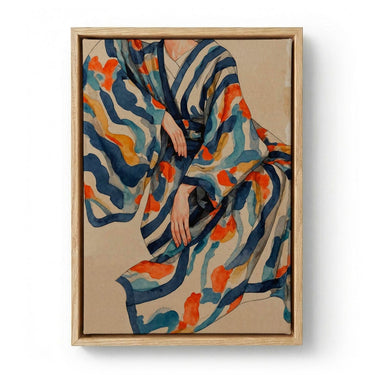 Un motif textile trouve naturellement sa place sur une surface textile. La toile de coton approfondit la palette méditative du Miuus Studio, donne corps aux plis graphiques et laisse la composition respirer comme un objet tissé. L'esthétique japonaise rencontre le tissu au sens propre. L'impression sur toile porte la précision silencieuse d'Ewa Sho comme une pièce accrochée avec soin — immobile, structurée, discrètement présente.