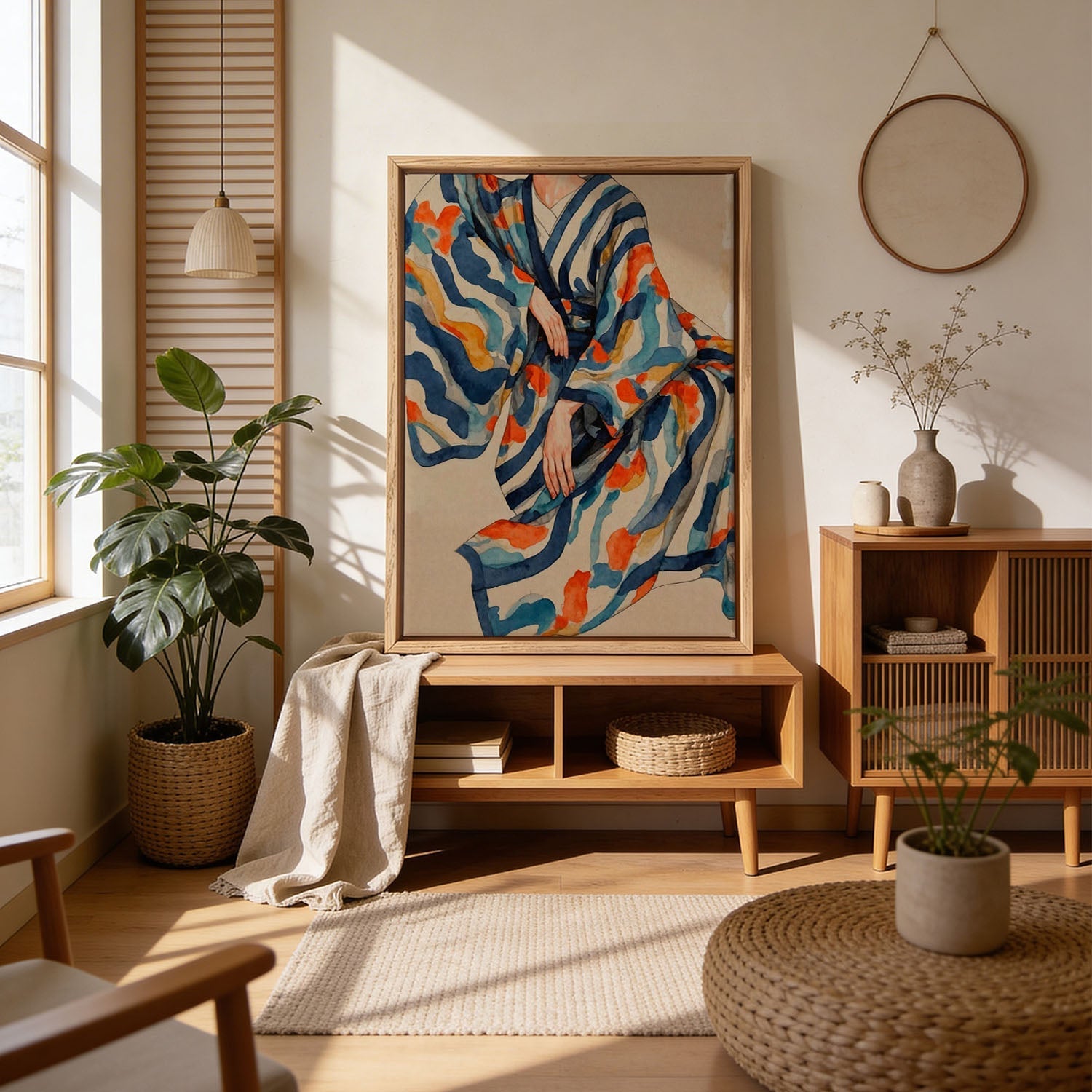 Le contraste vaut mieux que l’accord parfait — Tu n’as pas besoin de faire correspondre exactement la couleur de ton mur. Une impression aux tes profonds sur un mur clair, ou une pièce forte dans une pièce neutre, paraît souvent bien plus intéressante qu’un accord de couleur parfait.