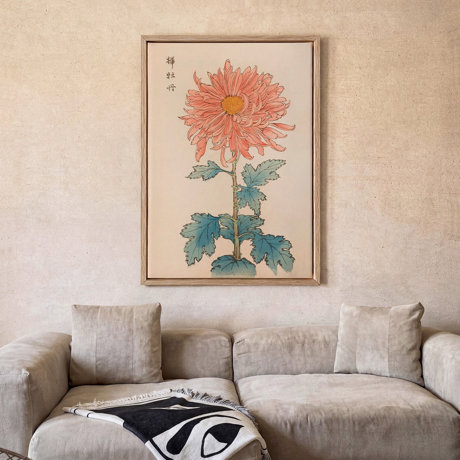 La structure en couches de ce cultivar — rayon ouvert, cœur dense — se traduit magnifiquement sur toile. Cette impression sur toile, produite dans notre atelier berlinois, utilise la texture tissée pour révéler la profondeur du disque capitonné et la chaleur des pétales extérieurs pâles, donnant à la composition une dimension tactile absente des éditions sur papier.