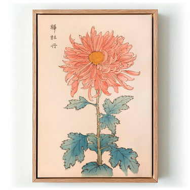 La planche 15 présente un chrysanthème de forme anémone — un cultivar distingué par ses larges pétales rayonnants et plats entourant un cœur en disque dense et capitonné. Hosegawa rend le contraste entre ces deux zones structurelles avec soin : les pétales extérieurs larges et légèrement réfléchis, le disque intérieur compact et d'apparence presque veloutée. Une seconde fleur plus petite s'incline dans le cadre depuis le bord inférieur, ancrant la composition et instaurant un dialogue silencieux entre formes ouvertes et fermées. La série de 1893 documentait la variété du chrysanthème à son point de plus grande diversification, et cette planche est parmi les plus riches botaniquement.