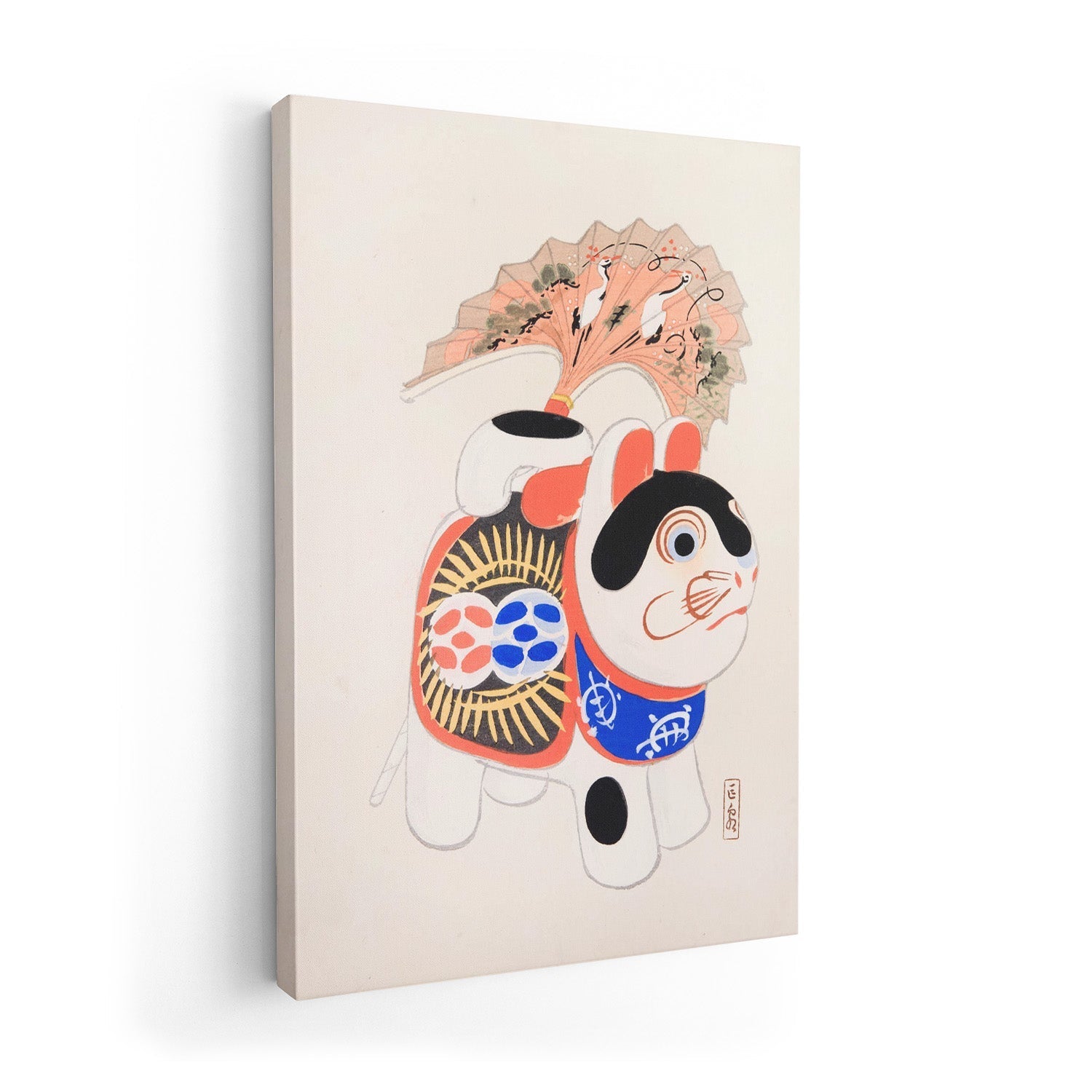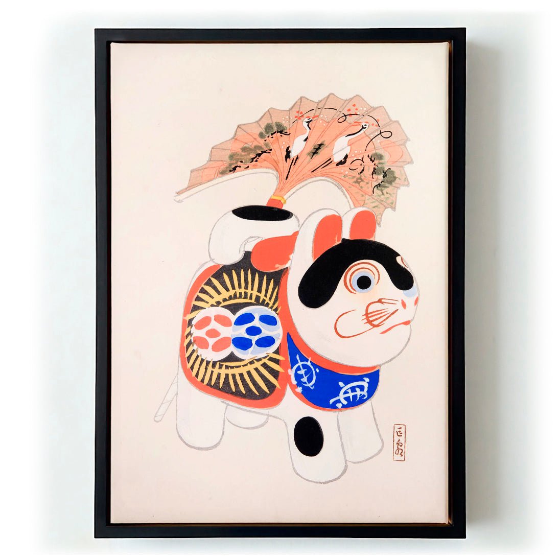La planche 058 présente l'une des pièces les plus enjouées de l'inventaire de Kyosen — un jouet dont la forme exagérée et l'expression peinte éclatante évoquent une origine festive ou rituelle. La composition s'articule autour d'une symétrie verticale, avec des motifs décoratifs rendus de la main précise et exercée de Kyosen. Des ocres chauds et des rouges sourds dominent, ancrant l'œuvre dans les pigments naturels de l'artisanat de l'ère Meiji. L'œuvre se situe à la croisée du document scientifique et d'une tendresse personnelle pour un monde en voie de disparition.