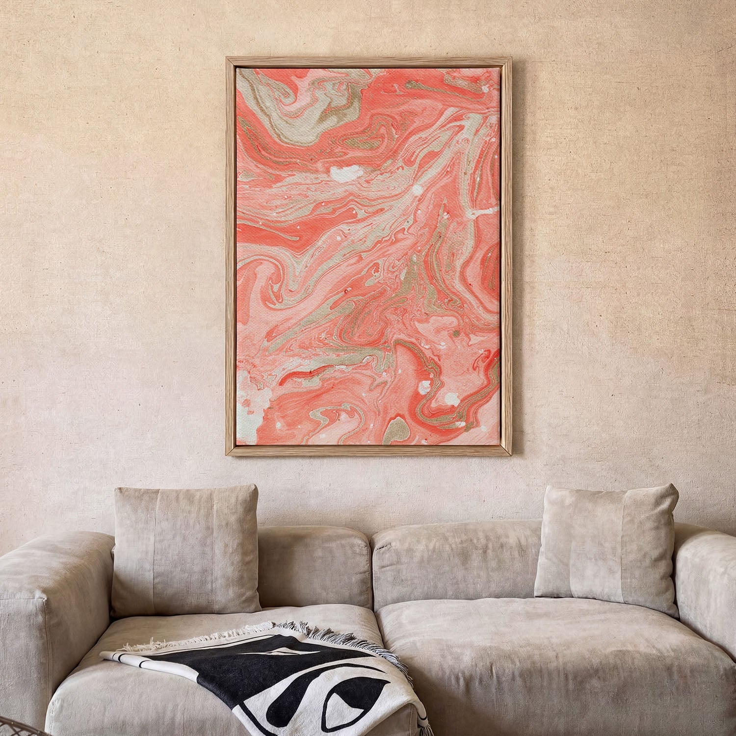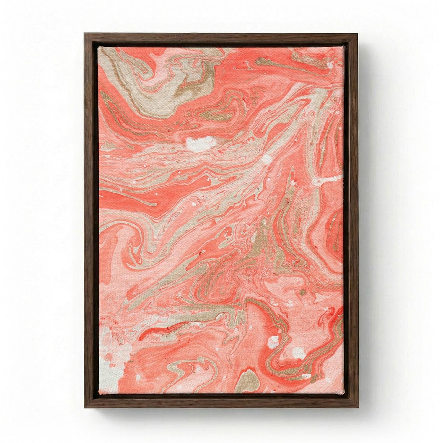 La tela amplifica il flusso marmorizzato della composizione di Santhosh. La trama trattiene il corallo caldo e le venature simili alla pietra con una profondità tattile, ammorbidendo le forme fluide in un movimento pittorico, così il pattern cristallizzato acquista un calore autentico da studio. Come stampa su tela, la corrente emotiva si radica nella parete con una presenza solida — il dialogo con la natura e la materia si svolge su un supporto texturizzato, lontano da qualsiasi riproduzione piatta.