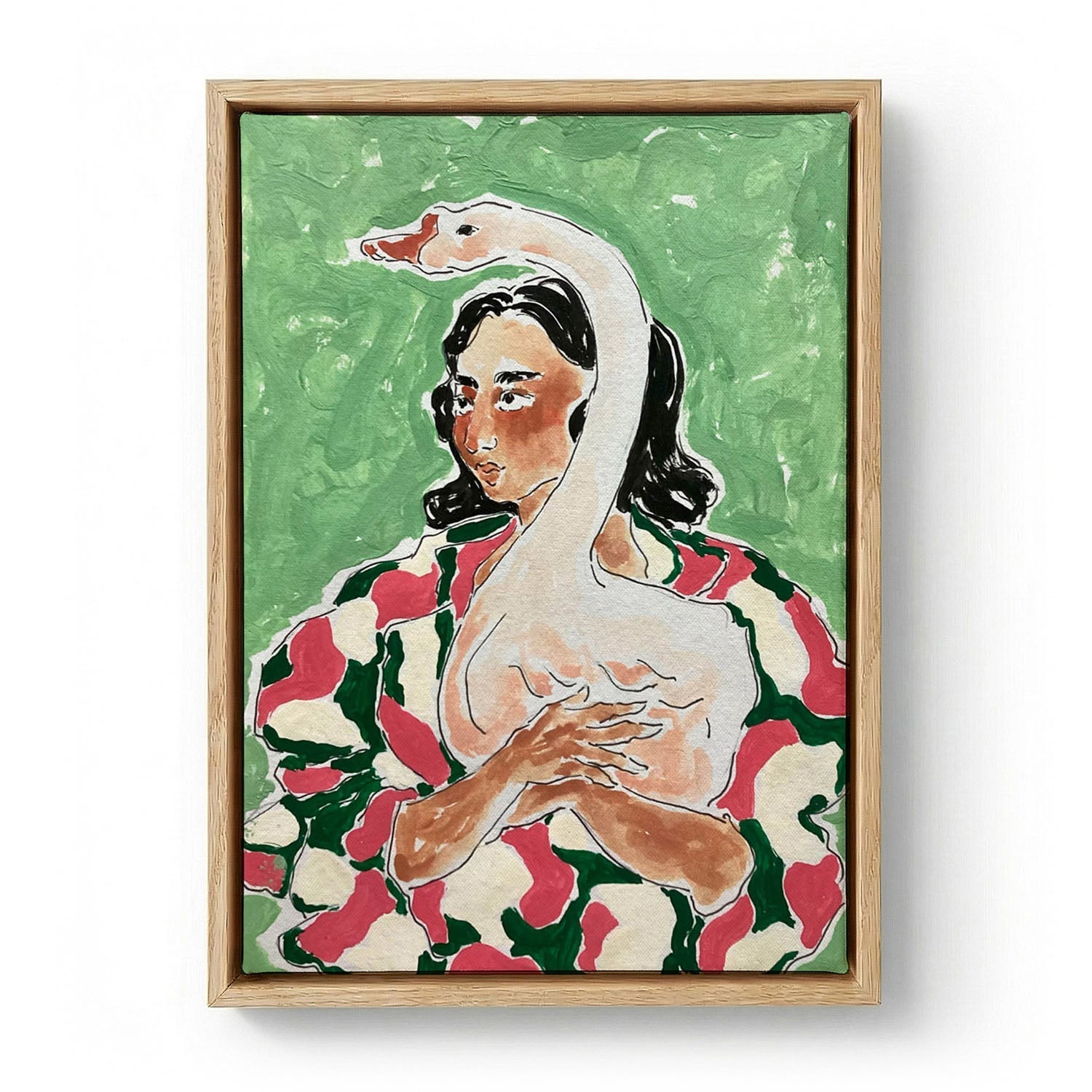 La combinazione di matita, inchiostro e gouache di Chowdhury trova la sua dimensione ideale su una superficie tattile. La trama della tela recupera la spontaneità grezza del metodo di lavoro originale, lasciando che le figure semplificate prendano vita con il calore di un disegno da studio piuttosto che di una riproduzione piatta. In questa stampa su tela, il tenero rapporto tra la bambina e l'animale si legge con una silenziosa presenza materiale — immediato, sognante e senza tempo.