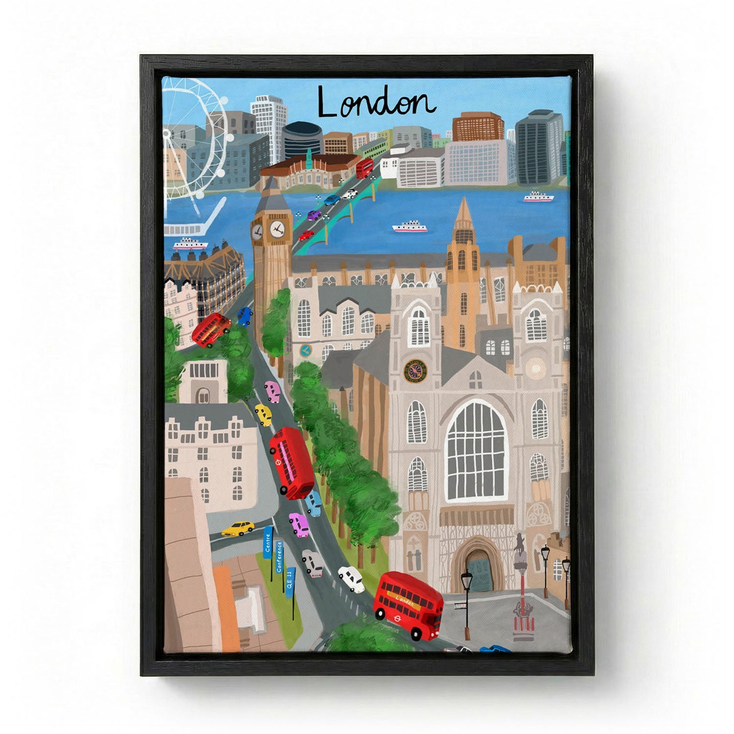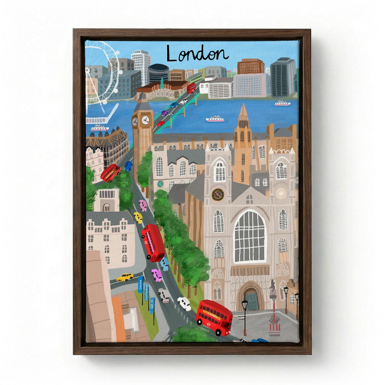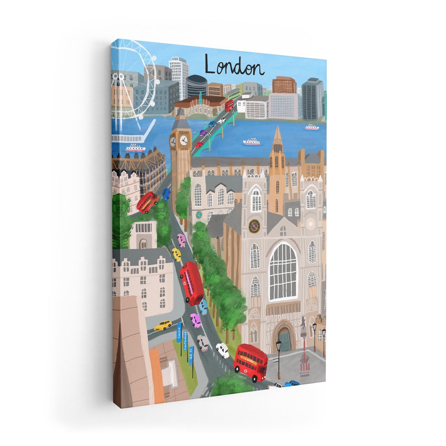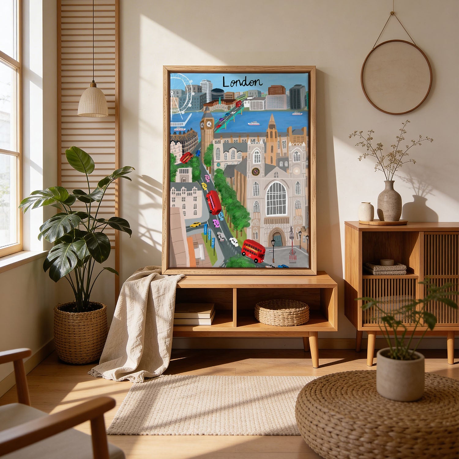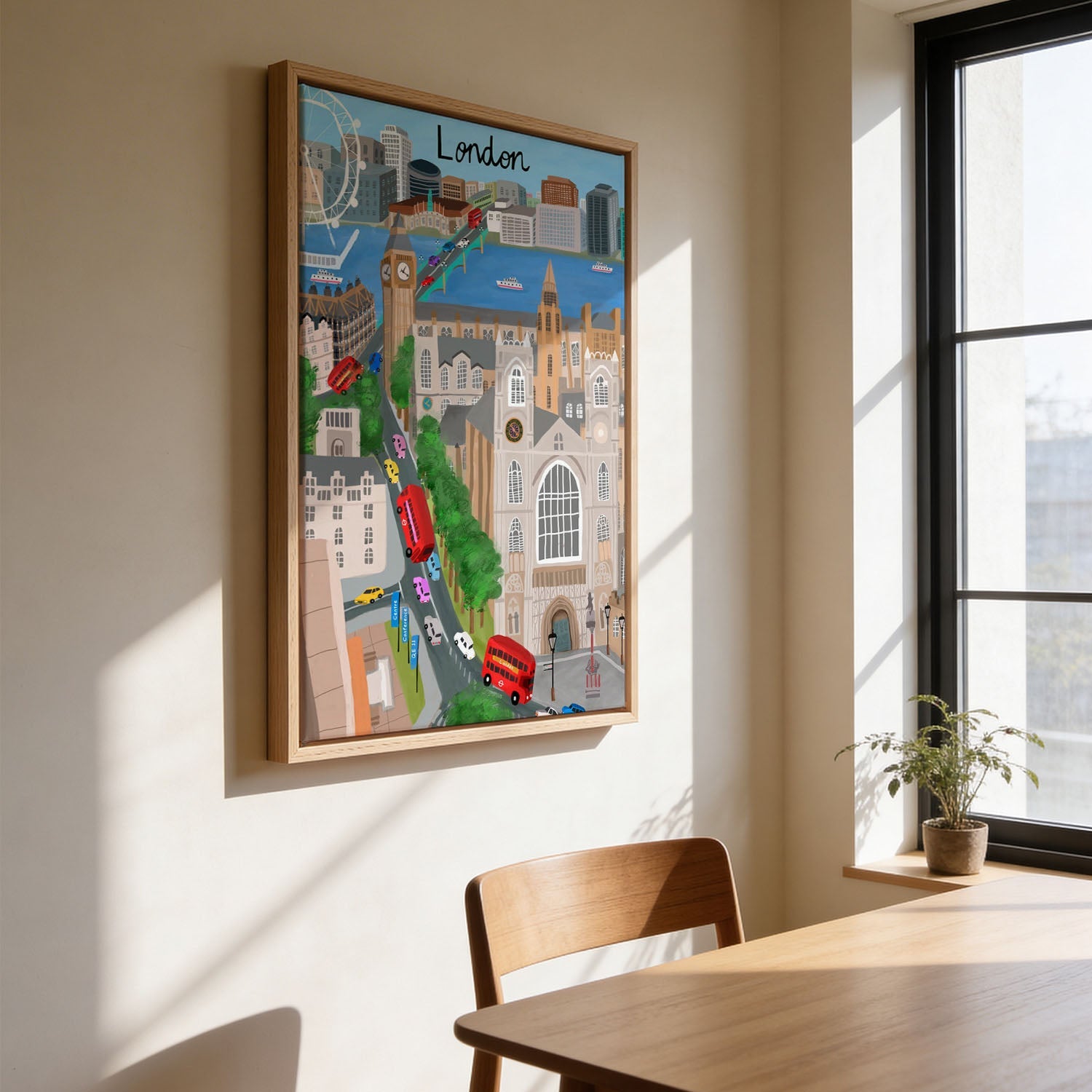 Su tela di cotone, il profilo londinese di Daly acquista un calore pittorico tutto particolare. La trama della tela esalta la palette satura e ammorbidisce i contorni illustrati, così il Big Ben e il Tamigi si posano su una superficie dalla vera profondità tattile. Come stampa su tela, l'energia grafica gioiosa si legge come una dichiarazione d'amore dipinta piuttosto che come un poster — i luoghi iconici portano con sé il calore artigianale di un dipinto murale, lontano da qualsiasi riproduzione patinata.