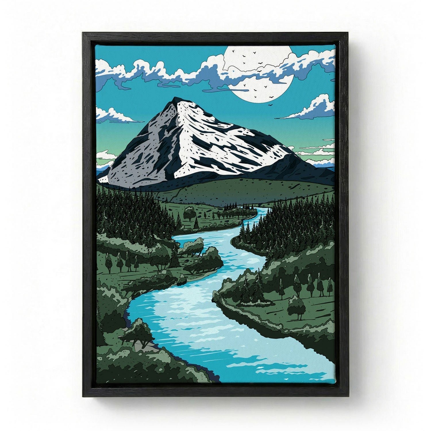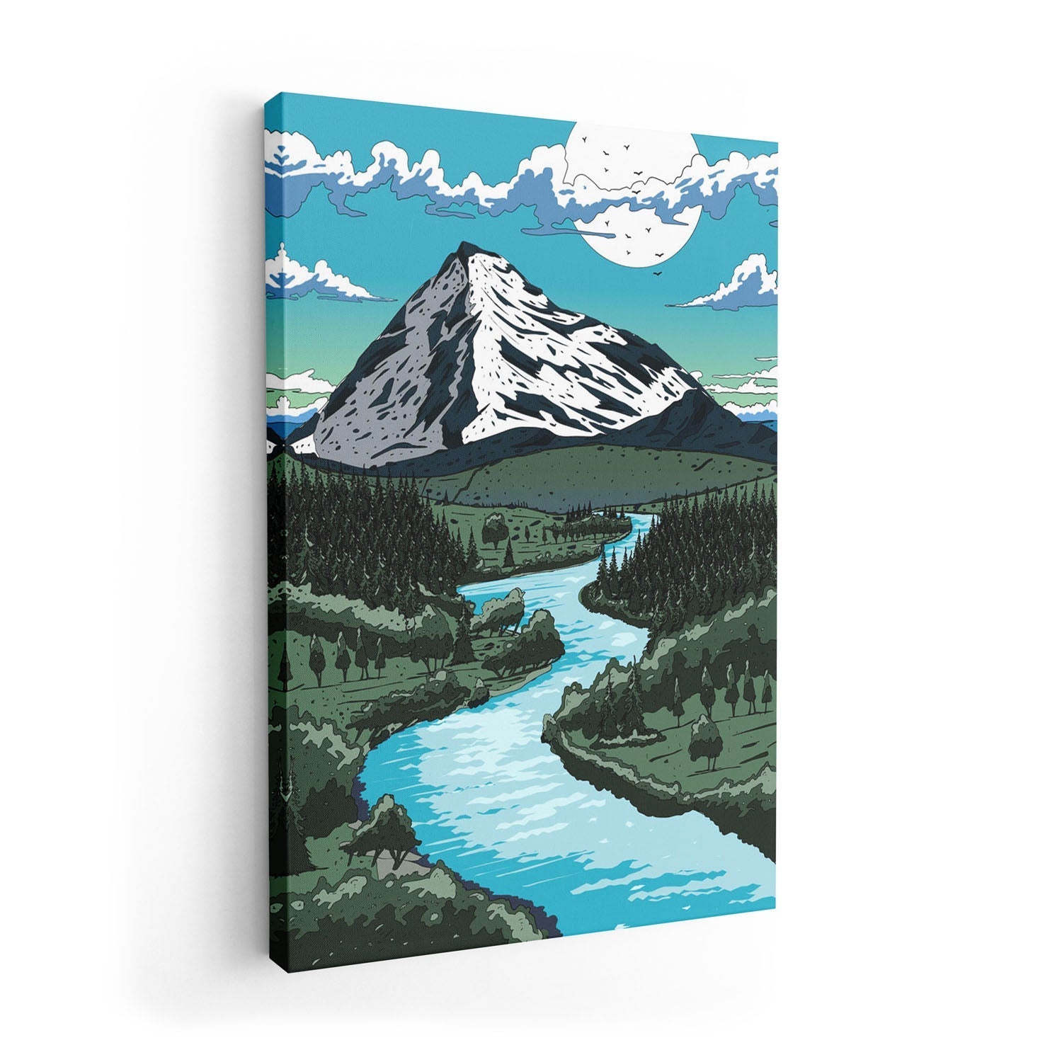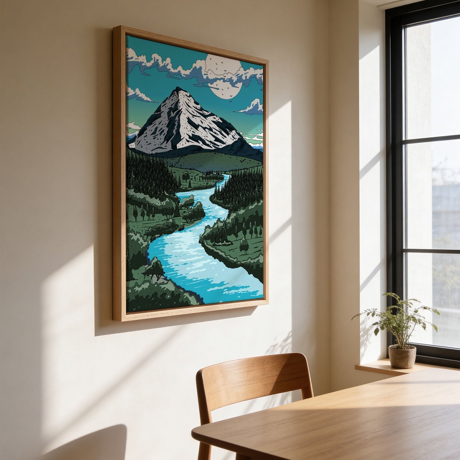 Su tela, le campiture piatte di Nicholas acquistano un peso materico reale — le cime stratificate e il fiume sinuoso si approfondiscono contro la trama, e la palette nostalgica si esprime con calore pittorico. La stampa su tela porta il dramma giocoso del paesaggio aperto con una presenza tattile concreta, trasformando un'illustrazione grafica in qualcosa di più vicino a un dipinto da studio sulla parete.
