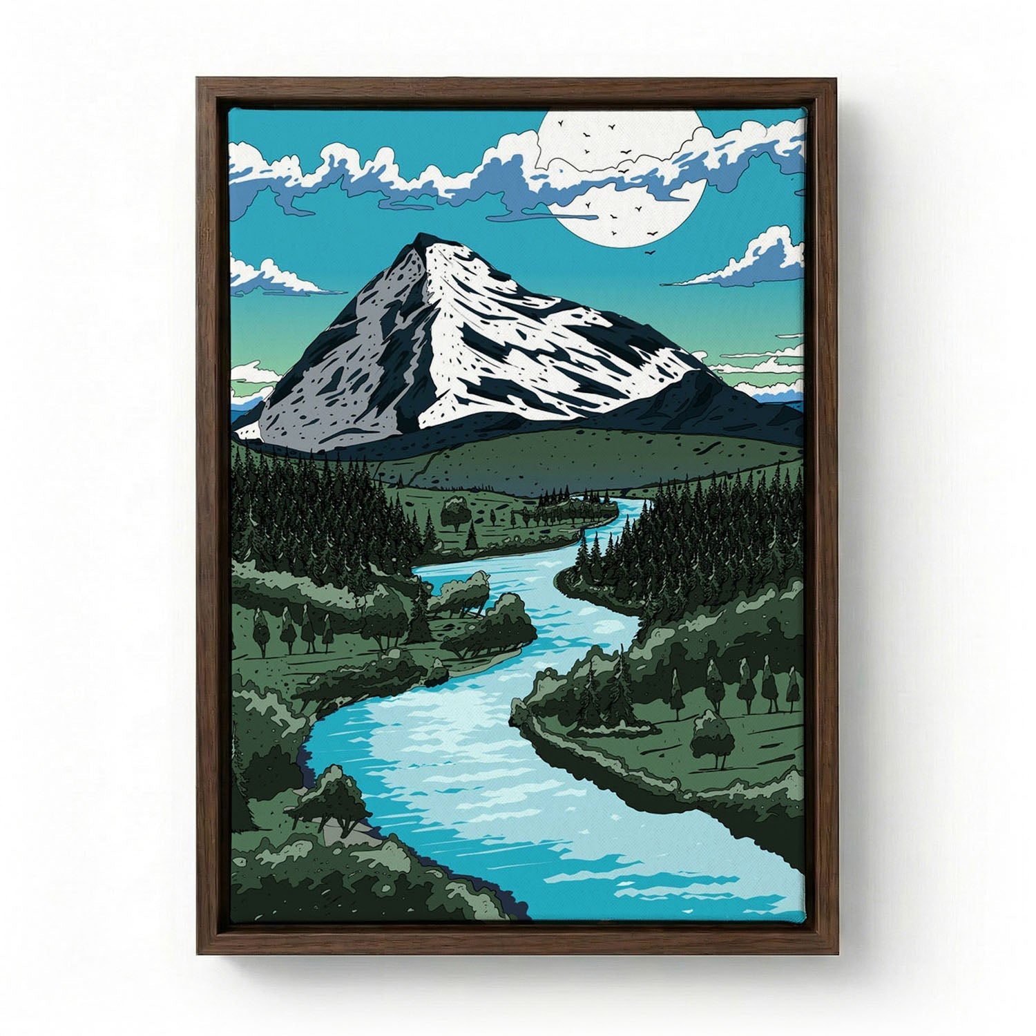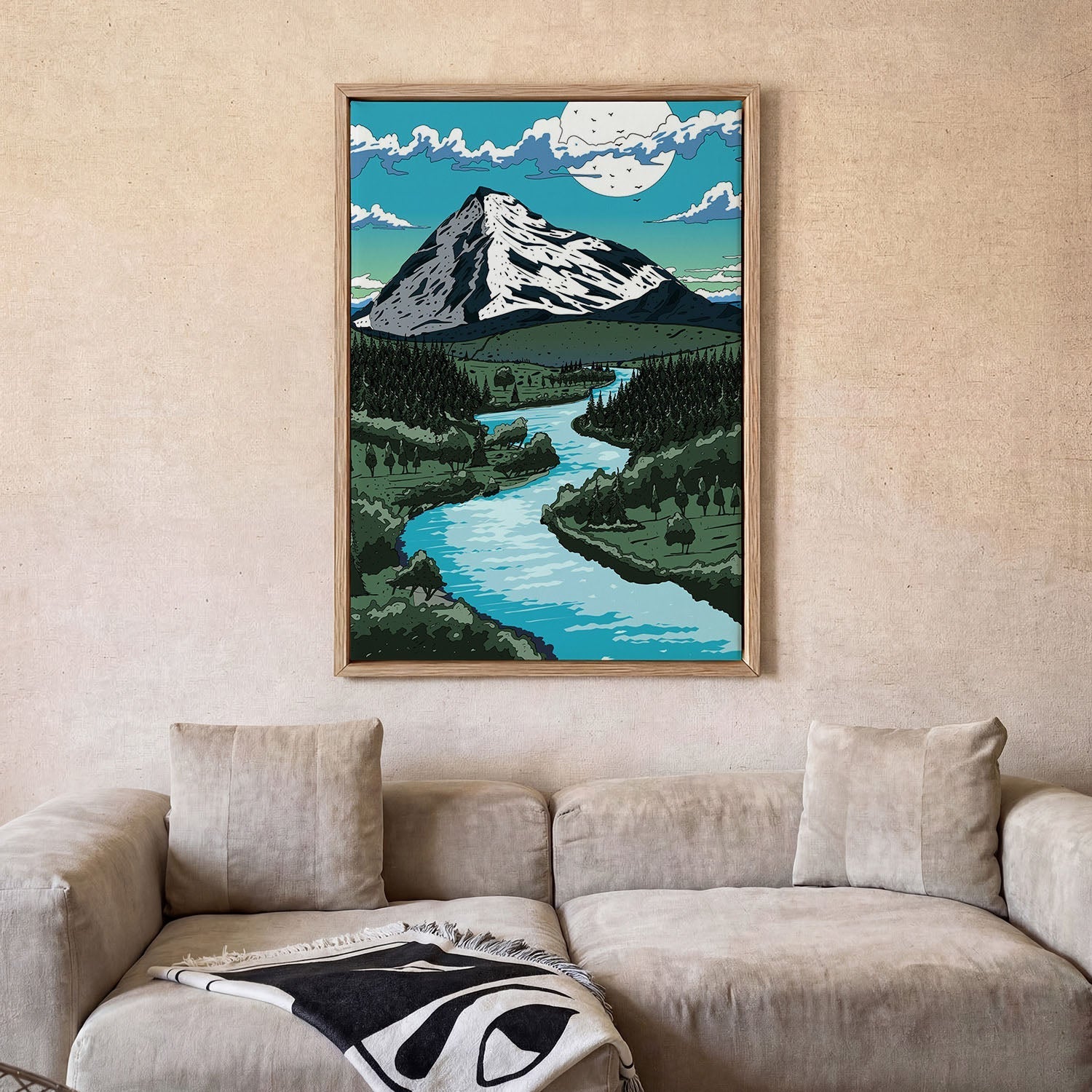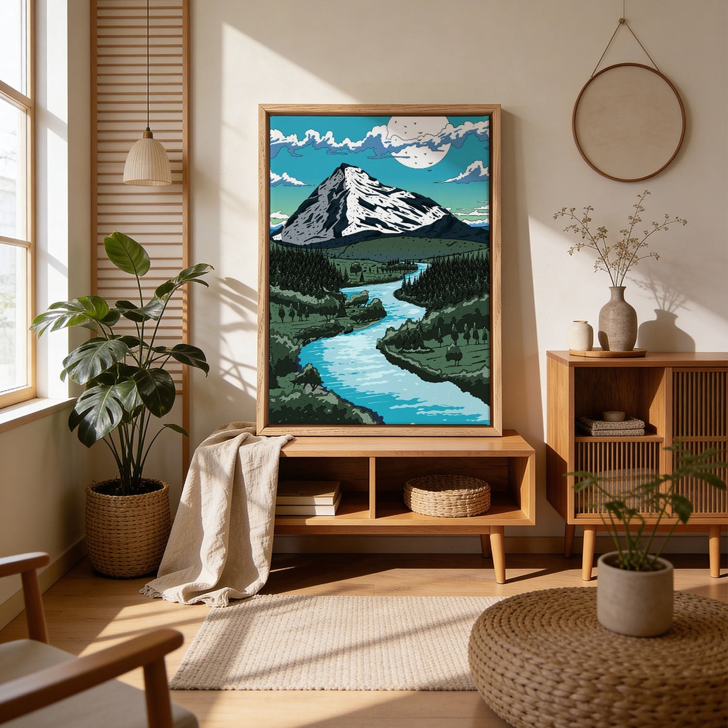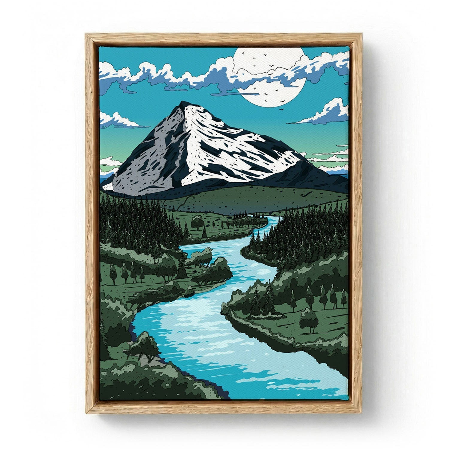 Su tela, le campiture piatte di Nicholas acquistano un peso materico reale — le cime stratificate e il fiume sinuoso si approfondiscono contro la trama, e la palette nostalgica si esprime con calore pittorico. La stampa su tela porta il dramma giocoso del paesaggio aperto con una presenza tattile concreta, trasformando un'illustrazione grafica in qualcosa di più vicino a un dipinto da studio sulla parete.