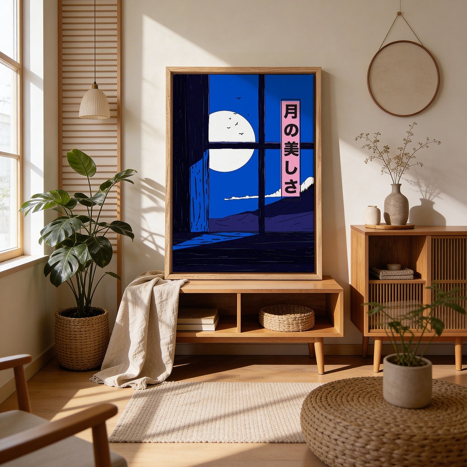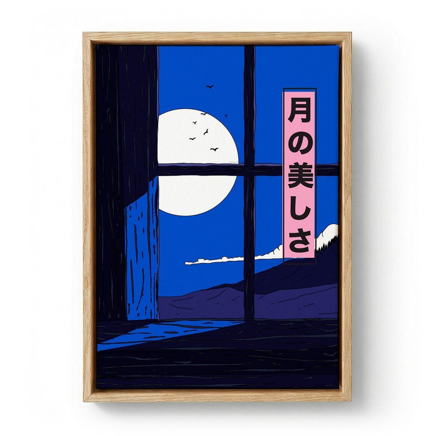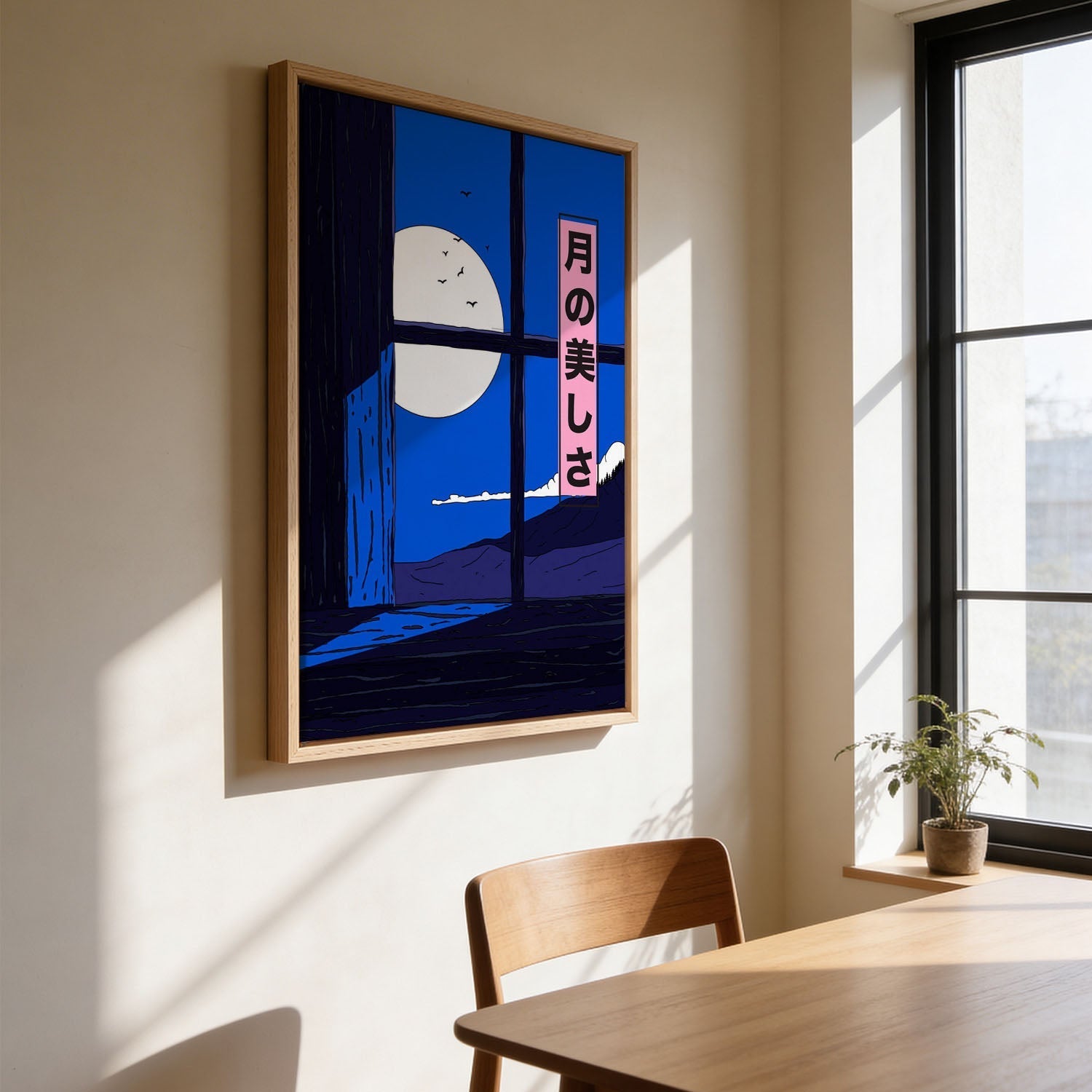 Su tela, la palette del cielo notturno si approfondisce nella trama — l'illustrazione retro-moderna acquista una morbidezza tattile che si addice al suo carattere lirico, e la luna mantiene la sua quieta meraviglia con una presenza fisica concreta. Questa stampa su tela trasforma la composizione di matrice asiatica contemporanea in qualcosa che assomiglia più a un dipinto che a una stampa, capace di reggere l'atmosfera che l'opera cerca di evocare.