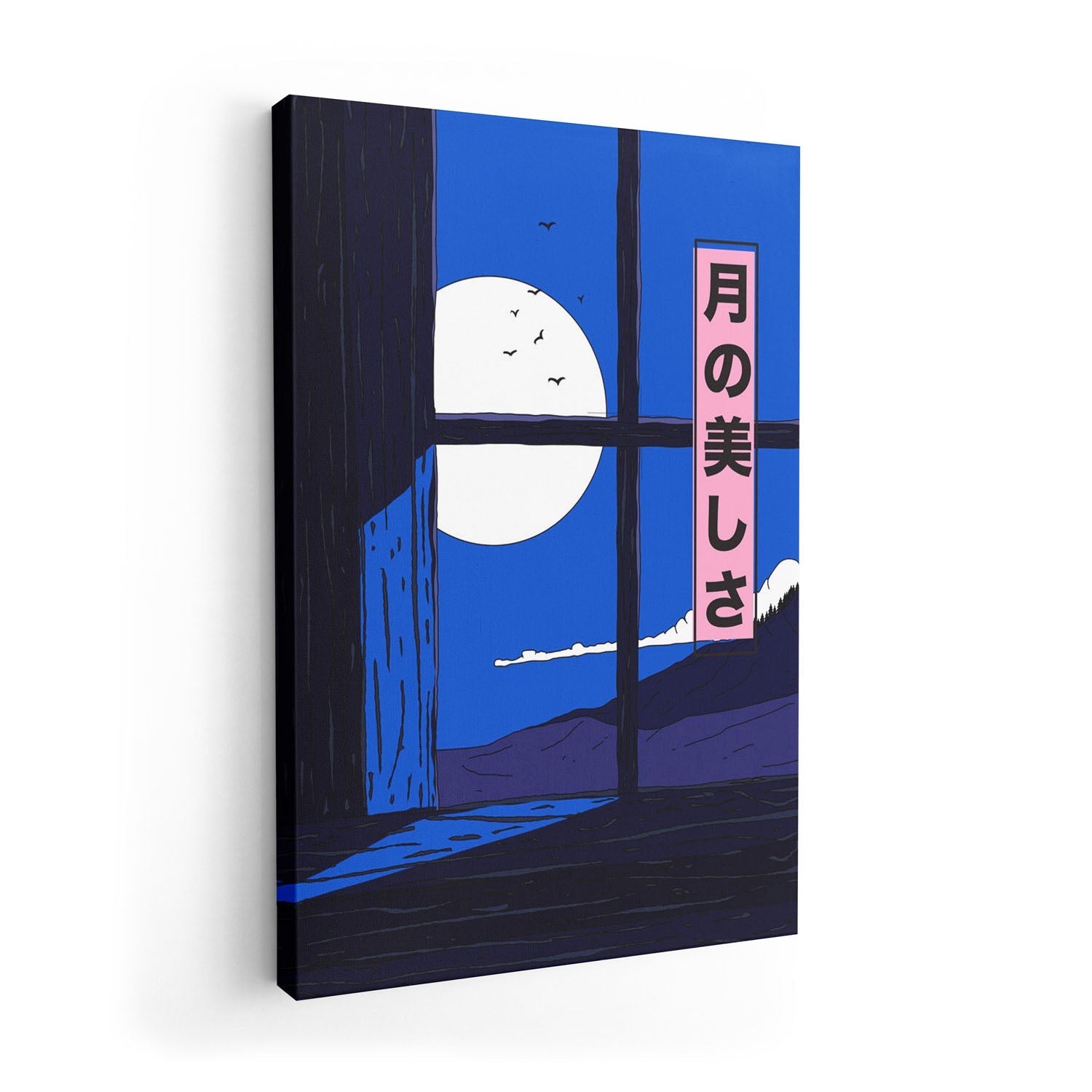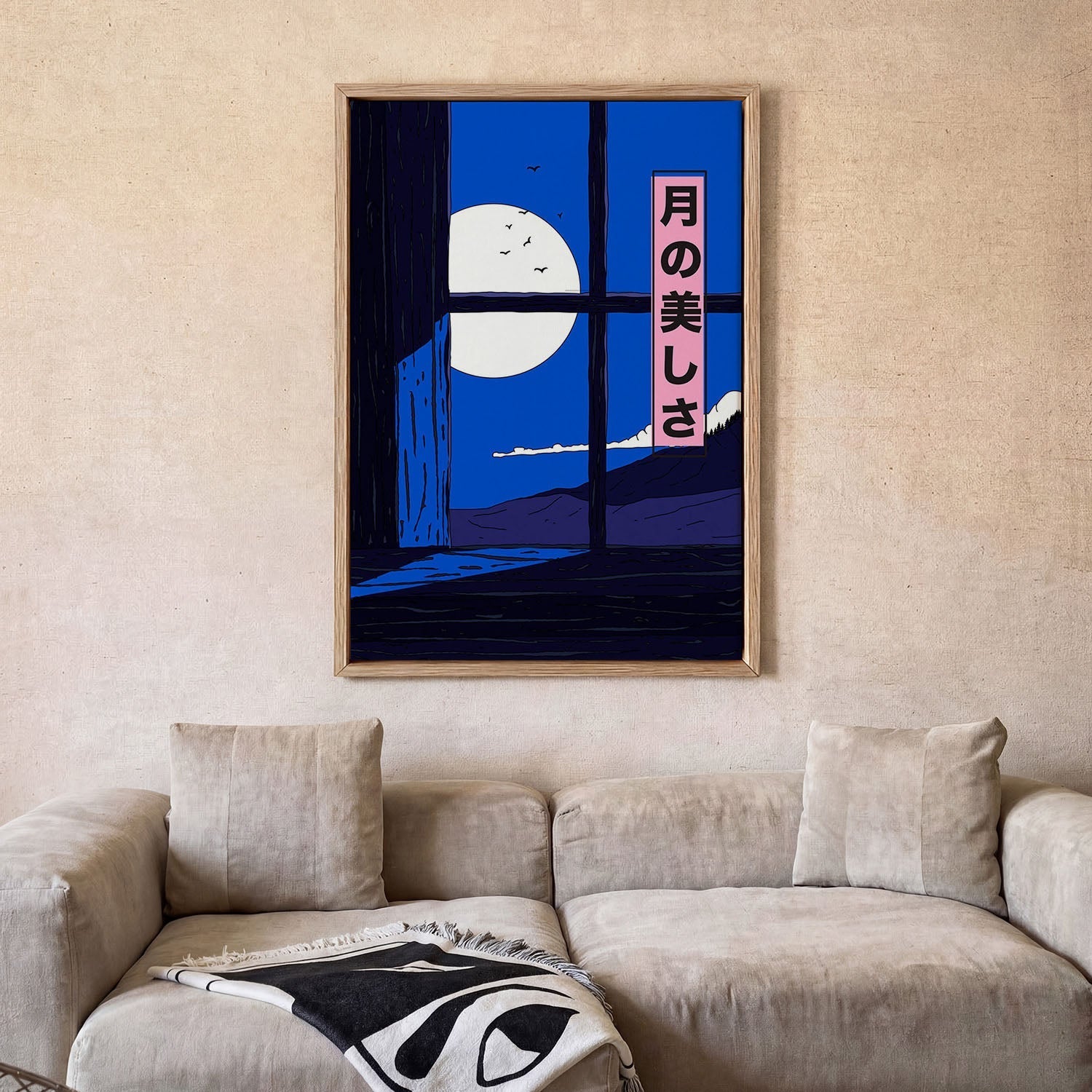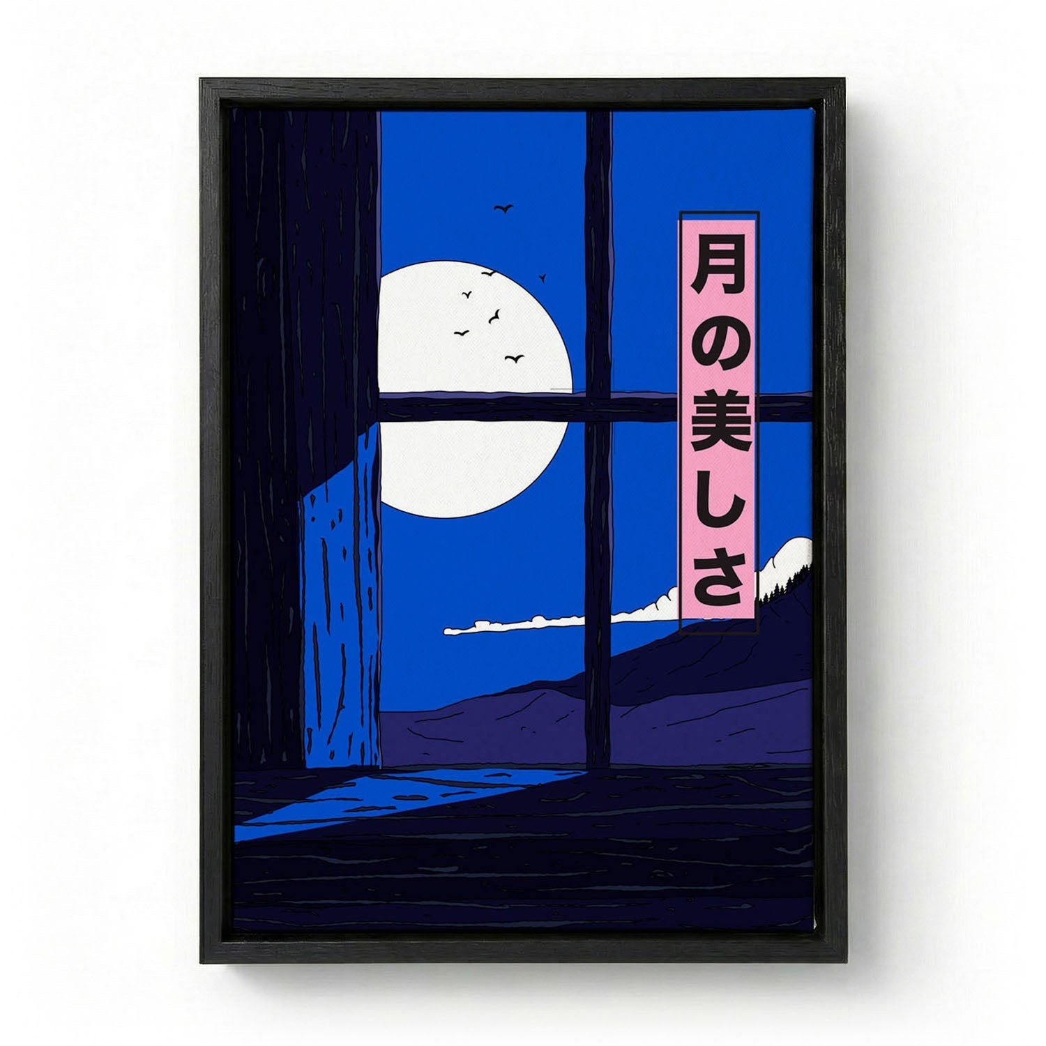 Su tela, la palette del cielo notturno si approfondisce nella trama — l'illustrazione retro-moderna acquista una morbidezza tattile che si addice al suo carattere lirico, e la luna mantiene la sua quieta meraviglia con una presenza fisica concreta. Questa stampa su tela trasforma la composizione di matrice asiatica contemporanea in qualcosa che assomiglia più a un dipinto che a una stampa, capace di reggere l'atmosfera che l'opera cerca di evocare.
