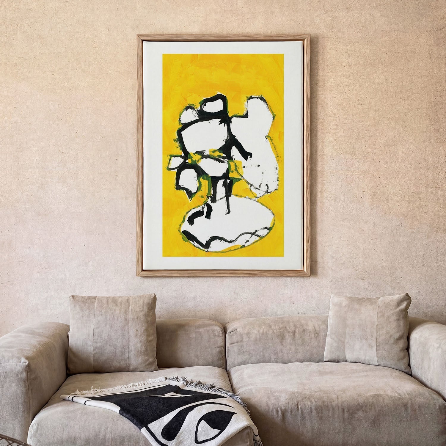 Il contrasto batte l’abbinamento — Non devi per forza far combaciare esattamente il colore della parete. Una stampa dai toni profondi su una parete chiara, oppure un pezzo deciso in una stanza neutra, spesso sta molto meglio di un abbinamento perfetto.
