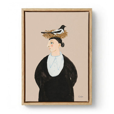 Su tela, il segno illustrativo espressivo di Roberts acquista la profondità tattile della pittura — la tensione silenziosa tra donna e uccello si mantiene con una presenza reale e concreta, e la composizione si arricchisce contro la trama con un calore pittorico autentico. Questa stampa su tela porta con sé la narrativa intima del pezzo come opera da studio, una superficie costruita per sostenere il tono quieto che il soggetto evoca.