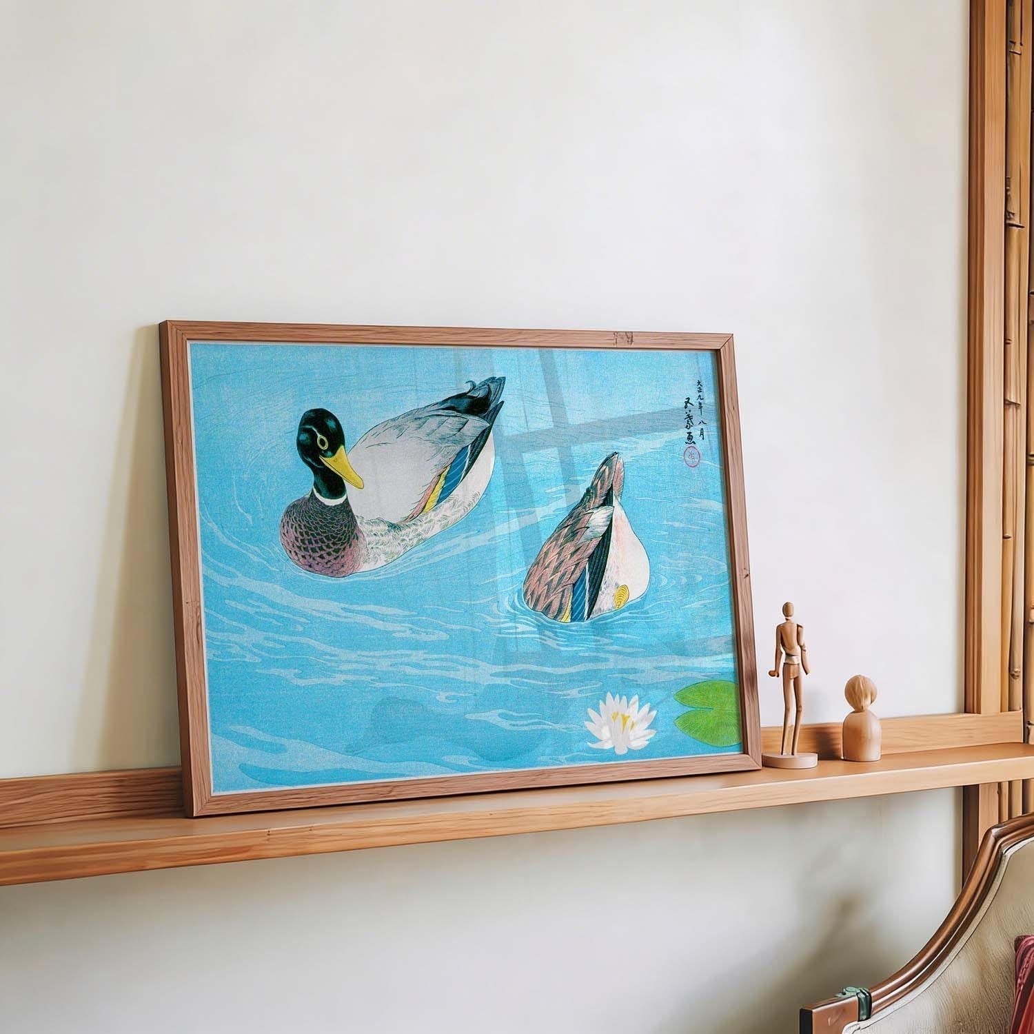 Goyo Hashiguchi maakte slechts een handvol houtsneden voor zijn dood op veertigjarige leeftijd, maar elk ervan bezit een stille intensiteit die veel omvangrijkere oeuvres heeft overleefd. Zijn bijin-ga-portretten — Woman Combing Her Hair, Woman After a Bath, Woman Applying Powder — tonen vrouwen in private, onbewakte momenten met een psychologische diepgang die opvallend modern aanvoelt. Anders dan de vlakke, decoratieve oppervlakken van eerdere ukiyo-e hebben Hashiguchi's figuren gewicht, aanwezigheid en individualiteit. Zijn natuurstudies, zoals Ducks, tonen dezelfde zorgvuldige aandacht voor lijn en toon.