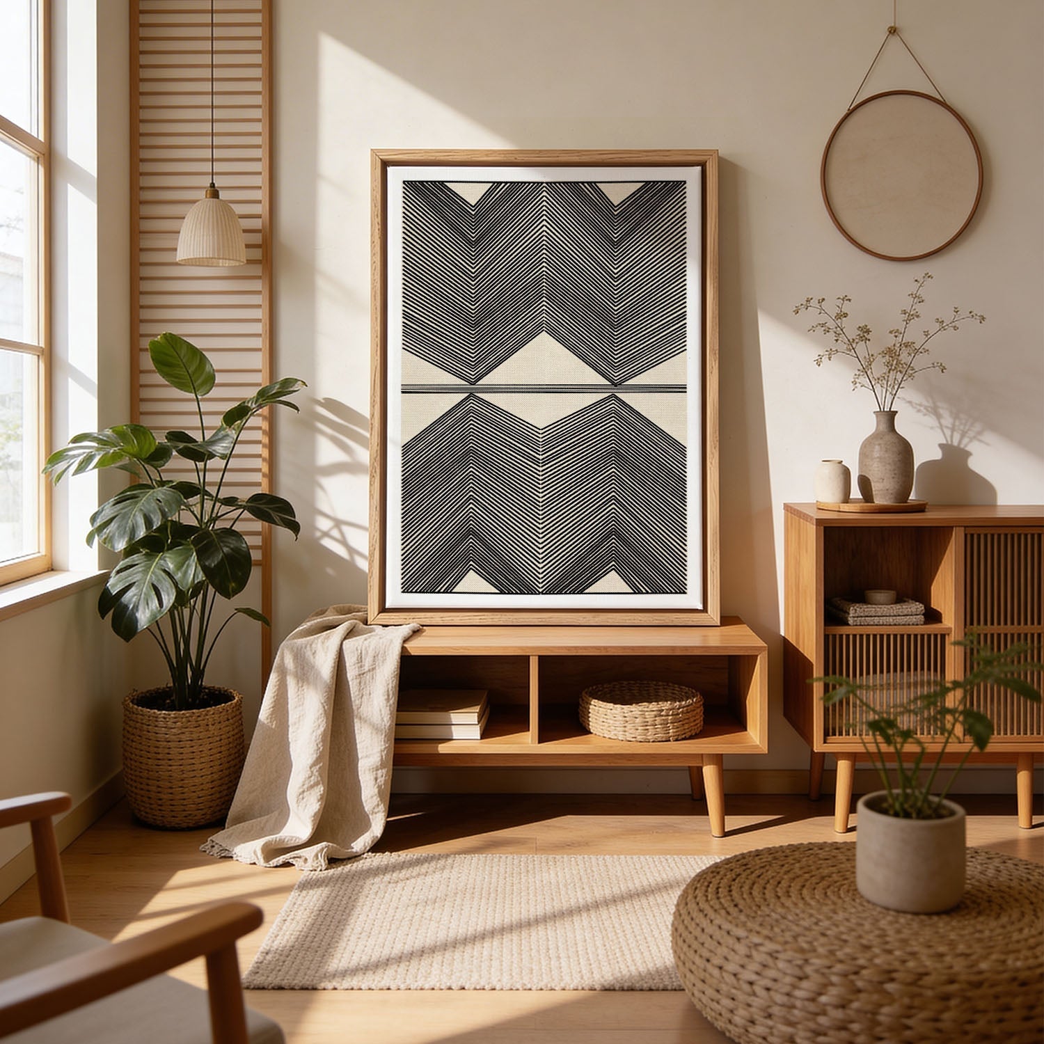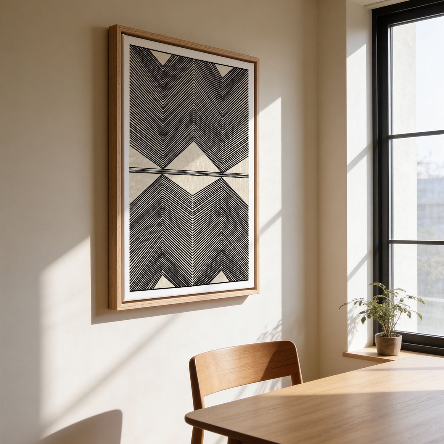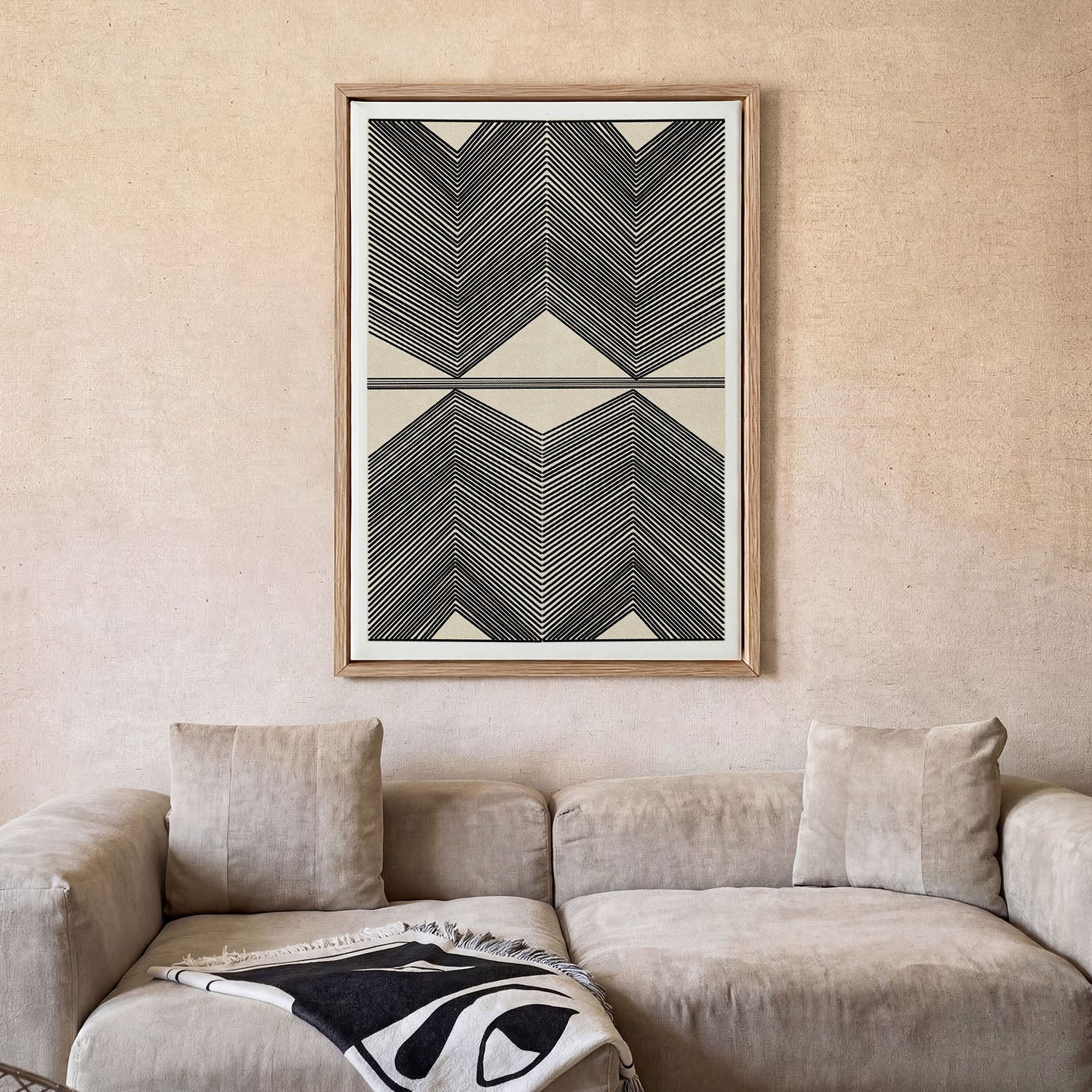 Hang op ooghoogte — Het midden van je print moet ongeveer op 145–150 cm van de vloer hangen. De meeste mensen hangen kunst te hoog — dan zweeft het op de muur.