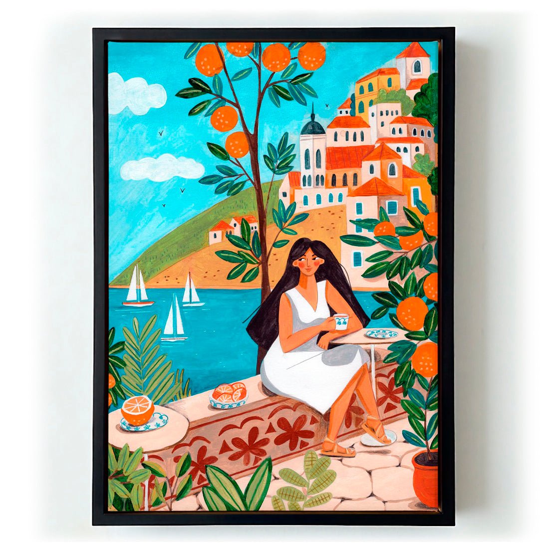 Mediterranean Coast distils the sensory richness of southern Europe into a single luminous image. Caroline Bonne Müller's characteristic flat colour fields and clean graphic lines capture dazzling light, turquoise water and the quiet pleasure of a warm afternoon by the sea. A lone figure anchors the composition, her posture easy and unhurried. The palette — cerulean, terracotta, warm white — feels entirely true to the Mediterranean spirit Bonne Müller paints so effortlessly.