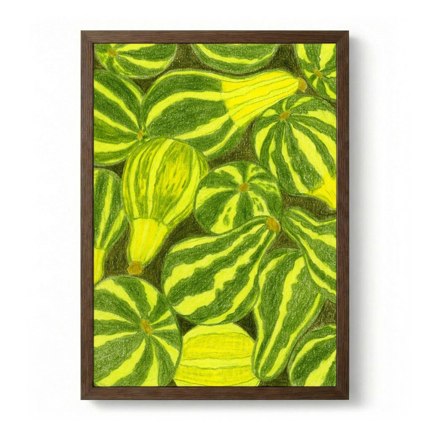 "Vibrant Striped Gourds" by Viktoriia Saunina is a work rooted in a modern visual vocabulary, drawing on contemporary graphic sensibilities. The image centres on food & drink subject matter, handled with the restraint and pacing of illustration. A considered palette sets the emotional register of the piece. It reads as a modern piece within the illustration tradition, at home on a considered wall. Small visual decisions — edge, weight, and spacing — keep the image reading cleanly at wall distance.
