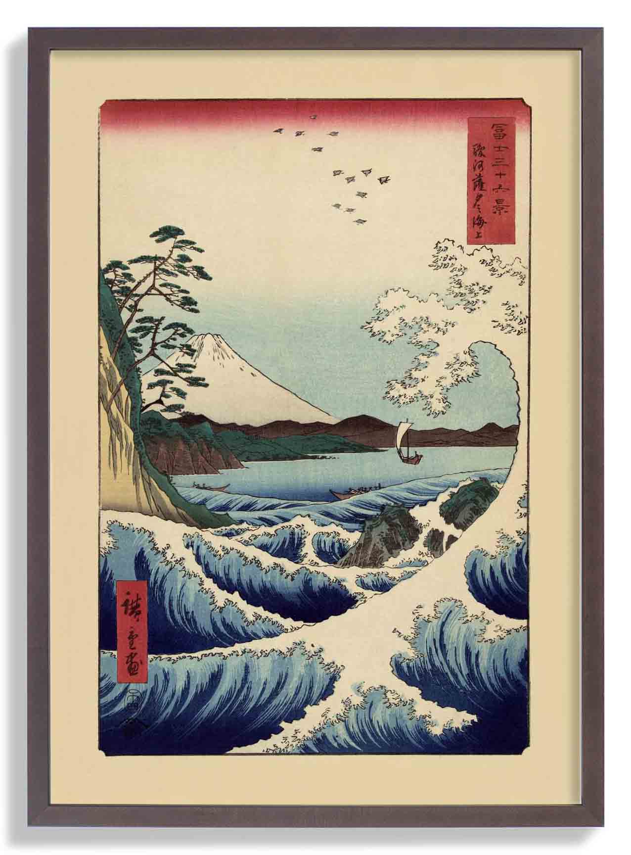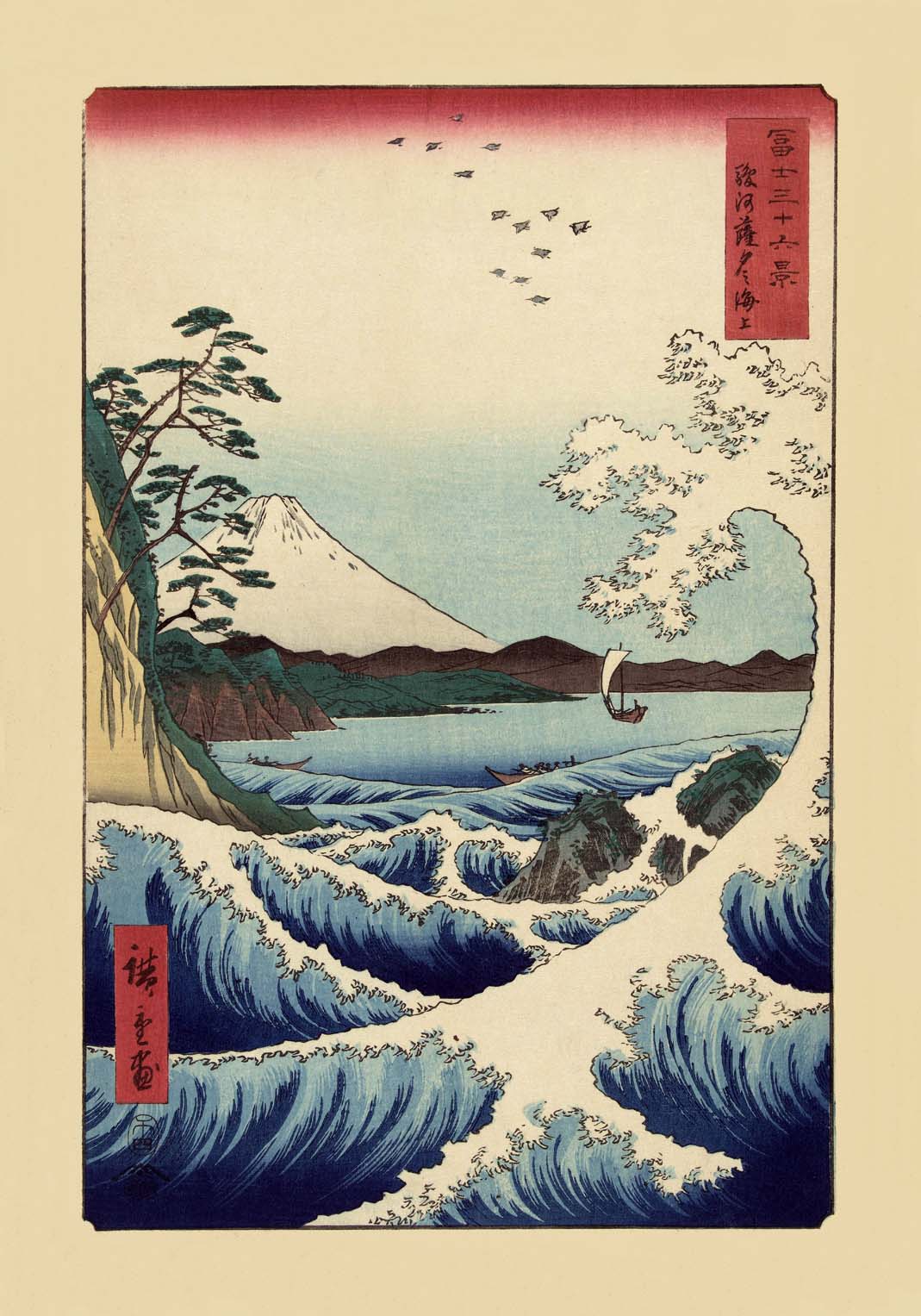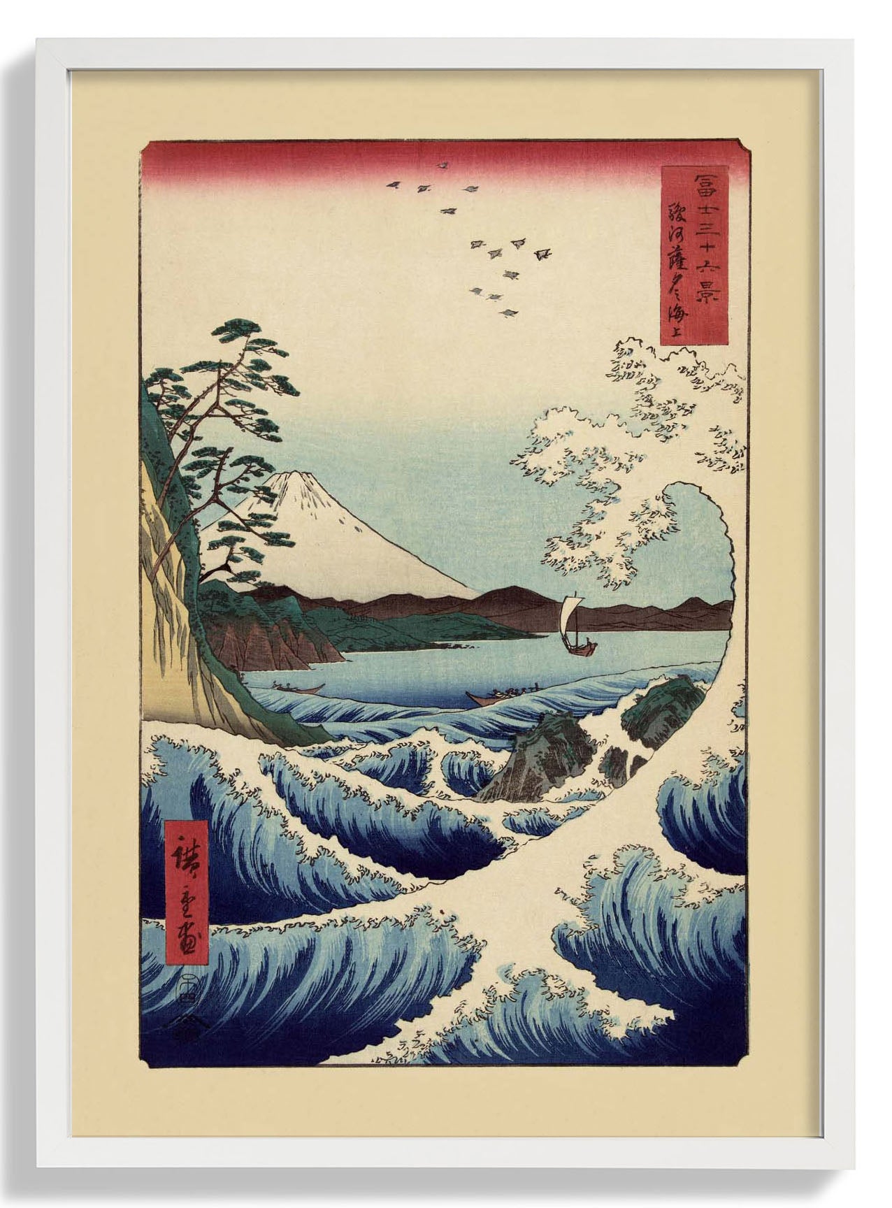 Wave and boat with Mount Fuji depicts the dramatic coastline at Satta in Suruga Province, where towering waves crash against rocky cliffs while Mount Fuji rises serenely in the distance. Created in 1858 as part of Hiroshige’s vertical series Thirty-six Views of Mount Fuji, the composition juxtaposes nature’s violence with its calm — churning sea set against the mountain’s stillness. Pine trees cling to the steep cliff face, and a flock of plovers scatters across the sky like flecks of spray. The print is a deliberate response to Hokusai’s famous Great Wave, reinterpreting the theme of sea and mountain through Hiroshige’s more atmospheric, contemplative lens.