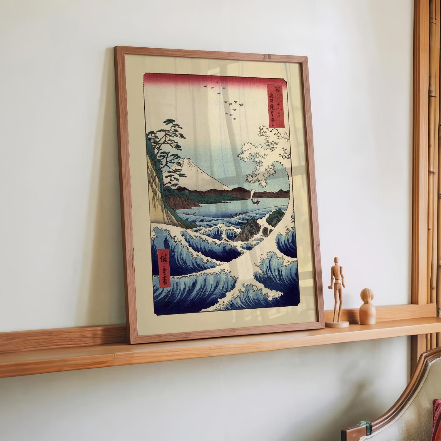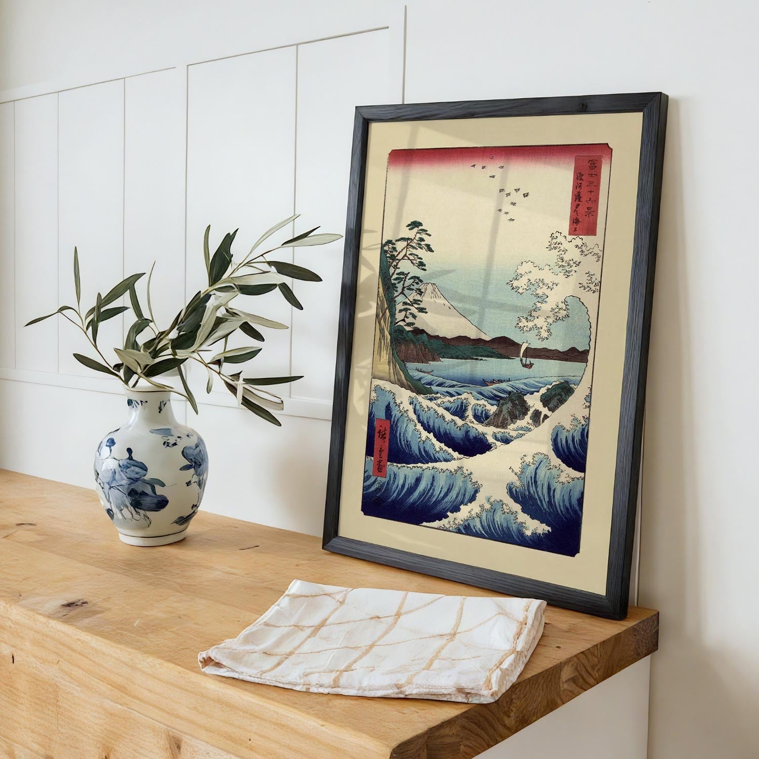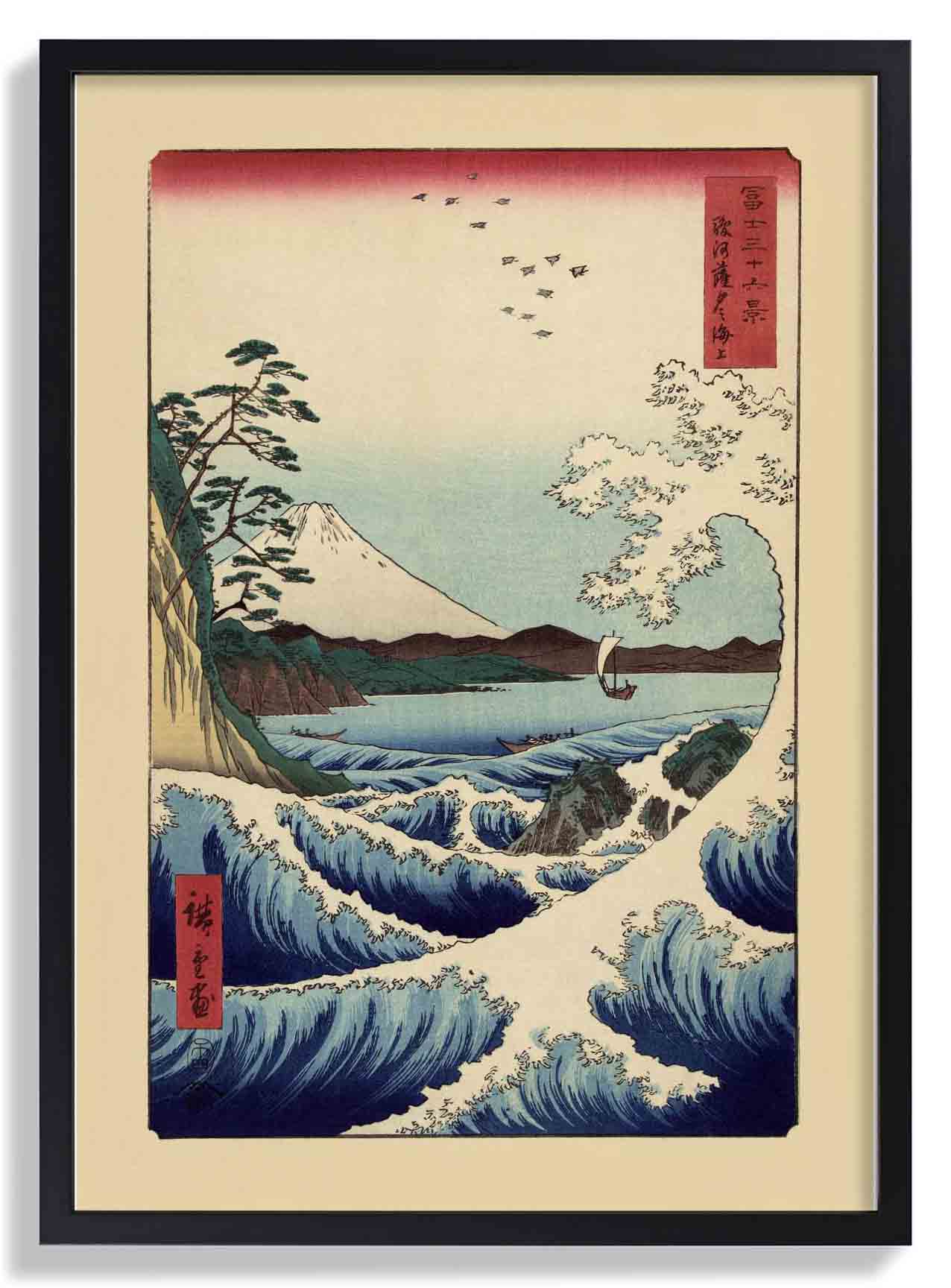 Wave and boat with Mount Fuji depicts the dramatic coastline at Satta in Suruga Province, where towering waves crash against rocky cliffs while Mount Fuji rises serenely in the distance. Created in 1858 as part of Hiroshige’s vertical series Thirty-six Views of Mount Fuji, the composition juxtaposes nature’s violence with its calm — churning sea set against the mountain’s stillness. Pine trees cling to the steep cliff face, and a flock of plovers scatters across the sky like flecks of spray. The print is a deliberate response to Hokusai’s famous Great Wave, reinterpreting the theme of sea and mountain through Hiroshige’s more atmospheric, contemplative lens.