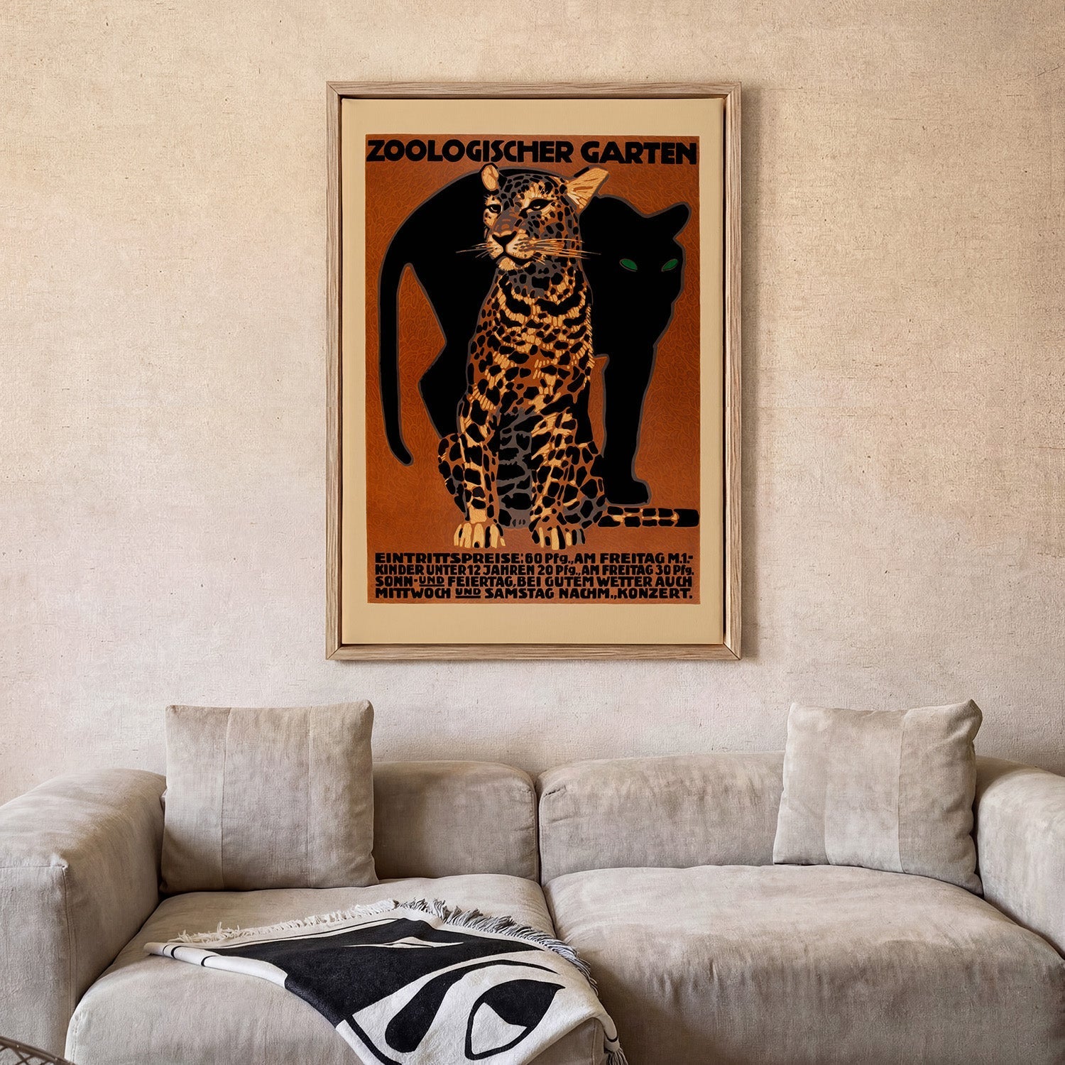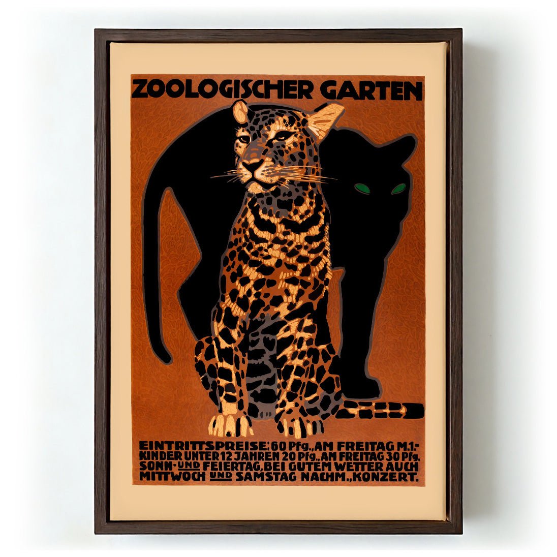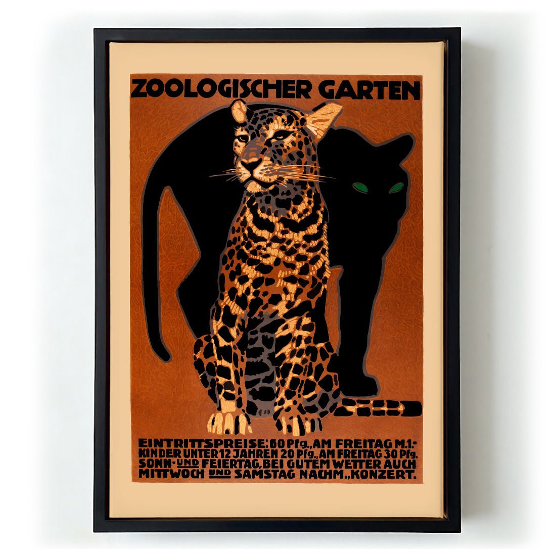 This vintage Zoologischer Garten poster captures the golden era of graphic zoo advertising — bold lettering, vivid animal illustration, and a confident poster-art composition designed to stop a crowd. The image balances decorative appeal with clear visual hierarchy: the animal subject commands the frame while the typography grounds the design in its cultural moment. Colours are warm and direct, printed flat in the lithographic tradition, giving the whole piece a graphic punch that remains immediately appealing across decades. It reads as both cultural document and striking decorative object.